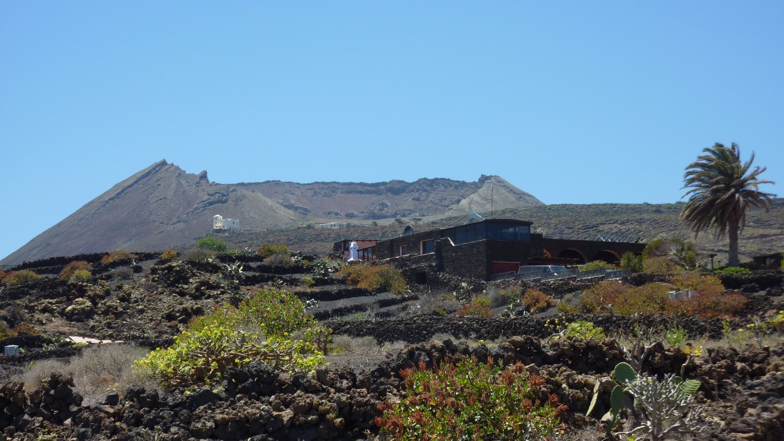Der Vulkan liegt nun bereits hinter uns und wir erreichen nach einer scharfen Rechtskurve die Asphaltstraße der (03) LZ-2 (171 m), an der wir rechts gehen. Besonders beeindruckend auf dem aktuellen Teilstück dieser Wanderung ist der krasse Gegensatz zwischen dem kultivierten Weinanbau auf der rechten Straßenseite und dem großen Lavafeld auf der linken Straßenseite - dem Malpais de la Corona. Malpais bedeutet schlechtes Land und charakterisiert die durch die sogenannte AA Lava zerklüftete Oberfläche, die nur schwer begehbar und landwirtschaftlich nicht nutzbar ist.