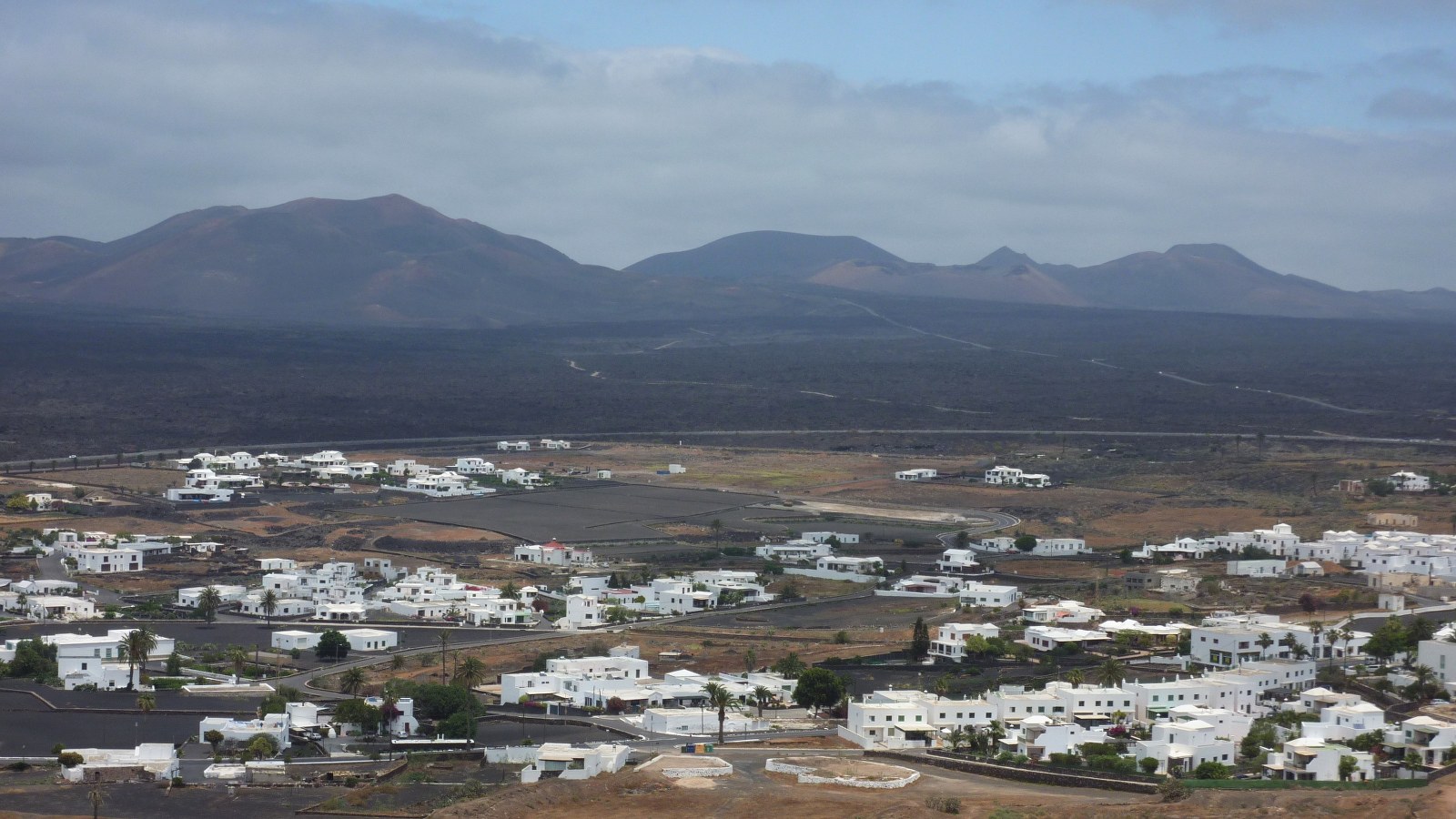 Dreht man sich um, dann hat man bereits an dieser Stelle einen schönen (03) Blick auf den Ort Yaiza (181 m) mit den Feuerbergen im Hintergrund. Durch eine lang gezogene Linkskehre geht es nun steil bergauf. Angekommen auf einem Bergkamm, von links kommt ein weiterer Schotterweg dazu, gehen wir scharf rechts - nun über dem Bergkamm - direkt Richtung Vulkangipfel.