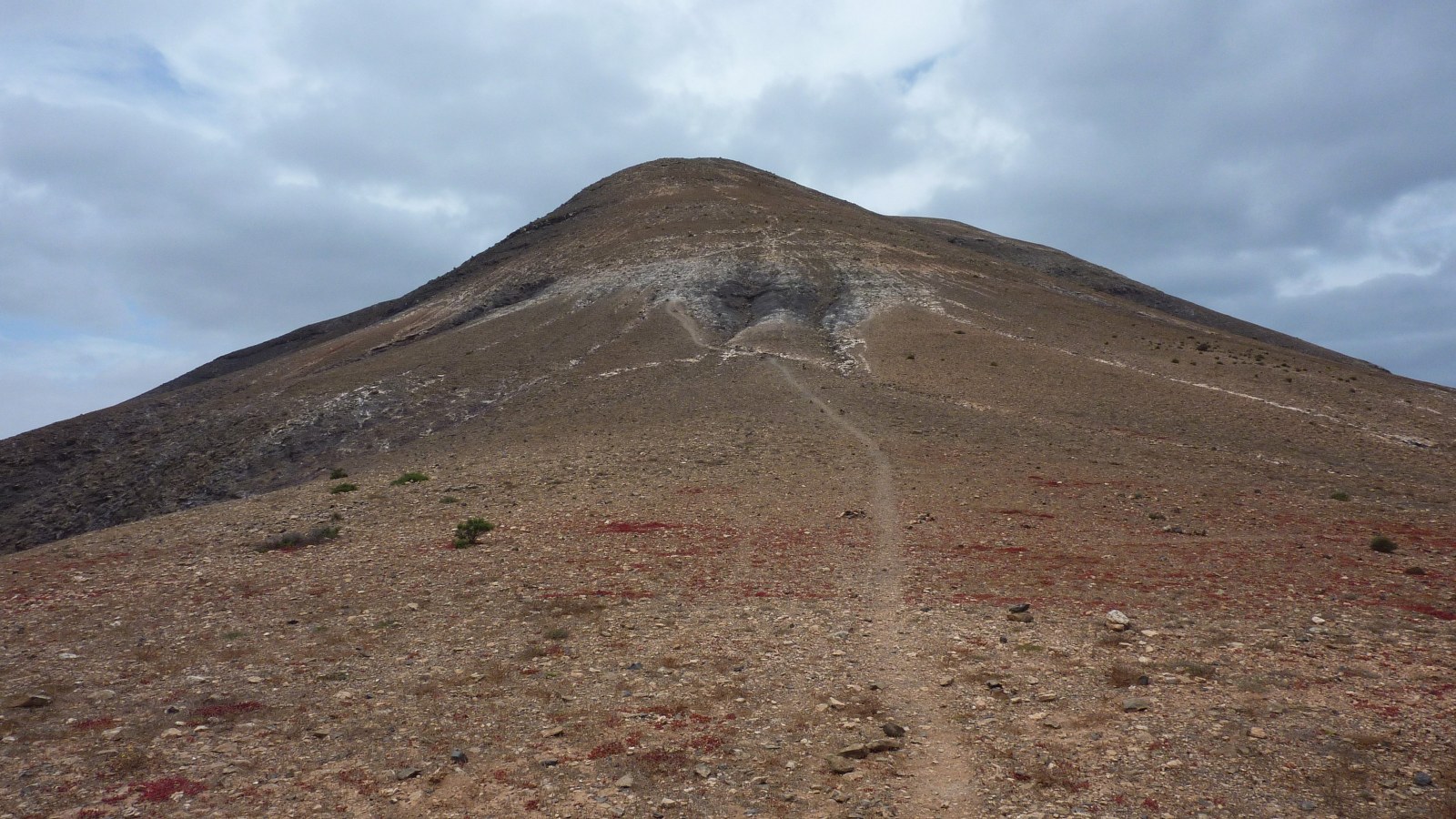 Kurz nach einem kleinen Hochplateau erreichen wir den (05) Gipfel Montaña de la Cinta (439 m). Auf dem Rückweg gehen wir den gleichen Weg bis zur Weggabelung (04) zurück, um bei einem Steinmännchen - links entlang der Erosionsrinne auf dem kaum erkennbaren Pfad - Richtung Tal zu gehen. Nach 300 m treffen wir auf ein größeres Barranco, an dem wir parallel entlangwandern. Nach weiteren 430 m - bei Kakteen, die am Wegesrand stehen - zweigt rechts ein Pfad auf einer Art Damm ab. Durch eine Linkskurve, gefolgt von einer Rechtskurve, erreichen wir die Schotterpiste, die wir schon auf dem Hinweg gelaufen sind.