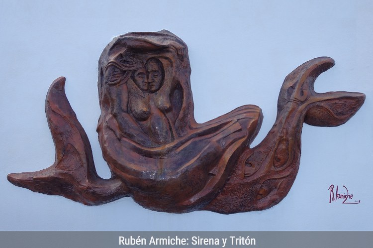 Ganz im Nordwesten der Insel El Hierro, bei der Ortschaft Pozo de la Salud, befindet sich in Meeresnähe die Finca Macuela. An der Mauerwand der Finca befand sich bereits das Wandbild einer Meerjungfrau von Felipe Benítez. Da das Bild in die Jahre gekommen war, wurde Rubén Armiche 2008 beauftragt, eine Skulptur mit diesem Thema herzustellen. Dabei setzte er erstmals eine neue Technik ein, indem er recyceltes Metall, Fasern, Modelliermörtel und Acryl verwendete. Meerjungfrauen wurden in der Kunstgeschichte oft mit Wollust in Verbindung gebracht. So wählte der Künstler als Motiv den Meeresgott, der sich der Meerjungfrau in einem gemeinsamen Liebeslied mit Blick auf den Atlantik anschloss. Das Paar verschmilzt zu einer erotischen Umarmung, in der der Mann seinen starken Arm um die Meerjungfrau legt. Die Flossen, verziert mit Meeresmotiven, runden das Kunstwerk ab.| GPS-Koordinaten 27.756270 -18.103062 | siehe Wanderung 28* |
