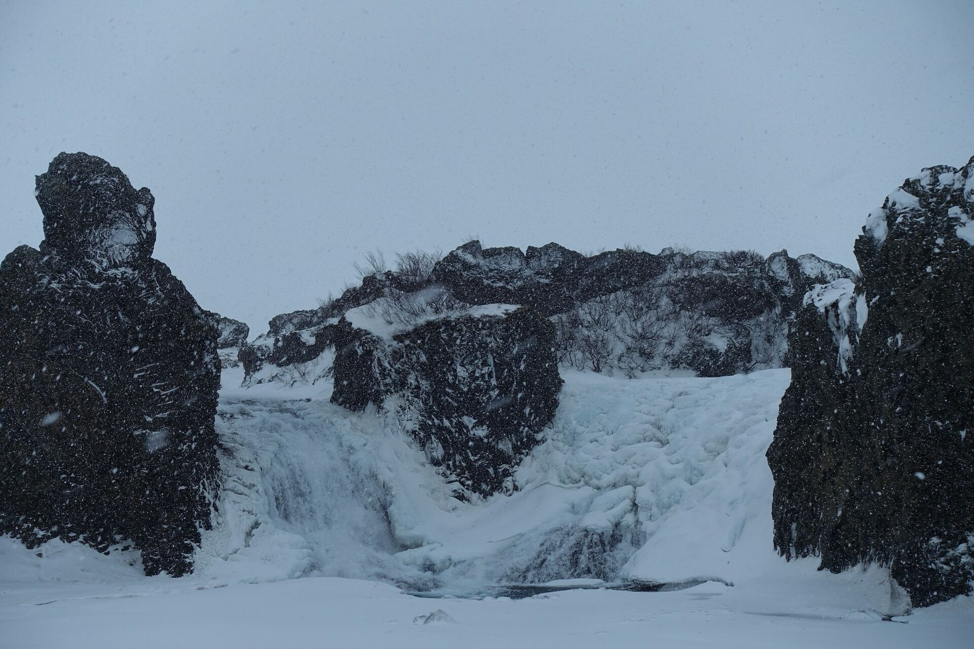 Island – Am Hjálparfoss macht die Fossá bei einem Schneesturm ihrem Namen alle Ehre.