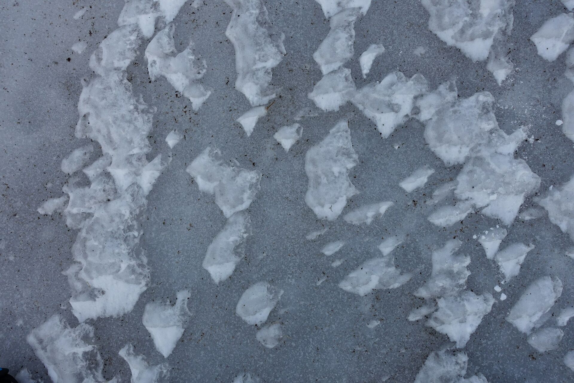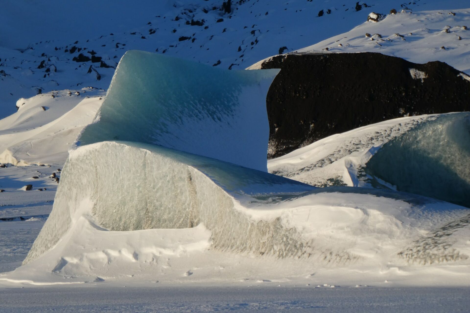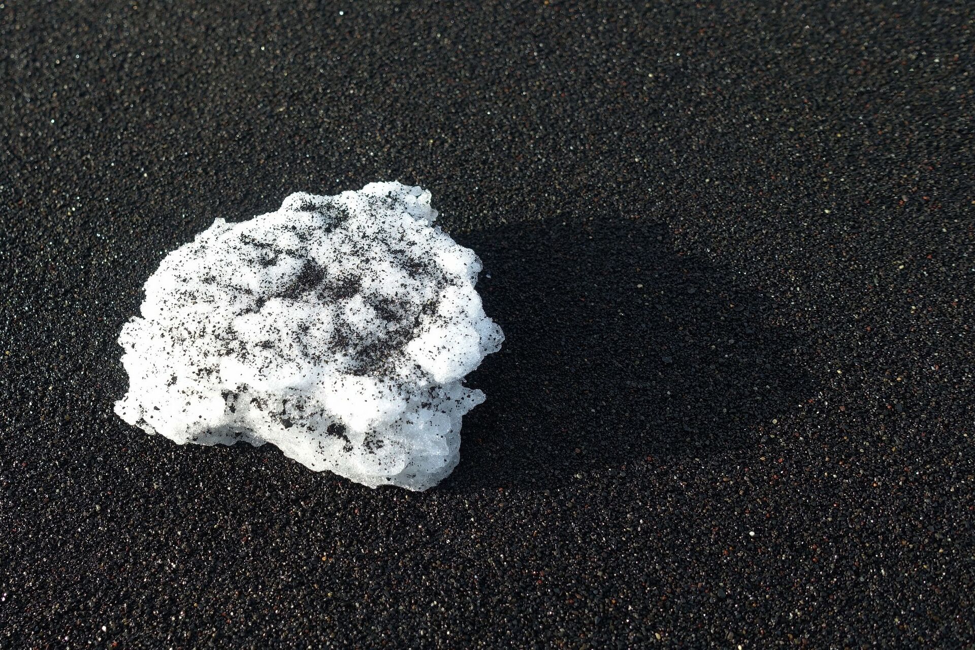 Island – Weißer Schneebrocken auf dem schwarzen Lavastrand.