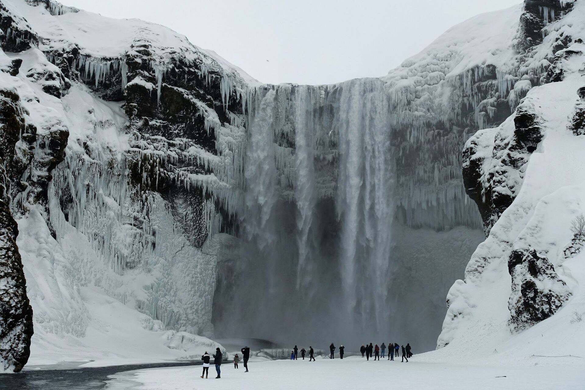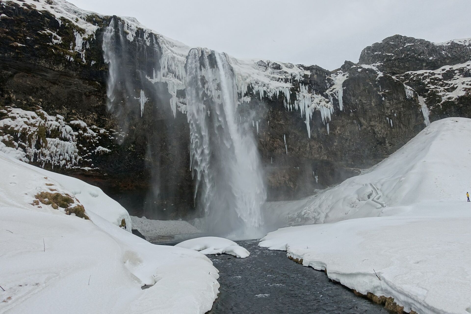 Island – Der Skógafoss mit seinen erstarrten Eissäulen.