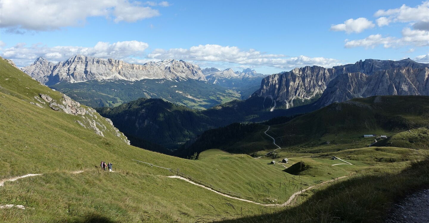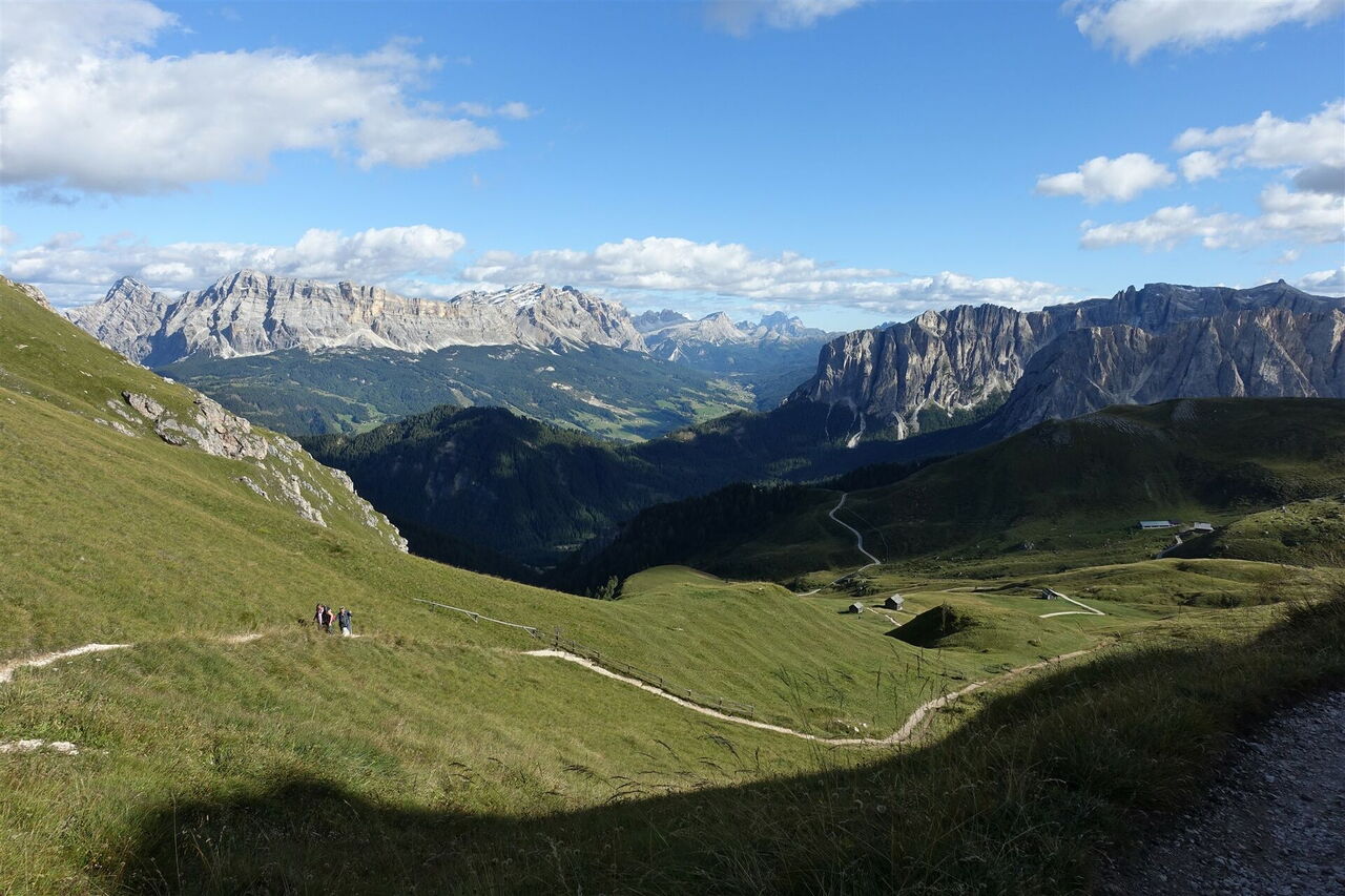 Nach ca. 2 km zweigt halb rechts die Schotterpiste zur 02 Schatzerhütte (2.004 m) ab. Wer keinen Espresso zur Stärkung benötigt, geht geradeaus weiter. Bei der darauffolgenden Gabelung der beiden Pisten gehen wir nicht halb links bergauf, sondern halb rechts. Nach einigen Metern mündet von links ein Pfad in den unsrigen. Es handelt sich hierbei um die Tour 31, die Hauptroute des Dolomitenhöhenweges Nr. 2. Die nächsten zwei rechten Abzweiger ignorieren wir, um dann am dritten Abzweiger rechts Richtung Peitlerscharte zu gehen, nun auf dem Wanderweg 4.