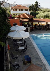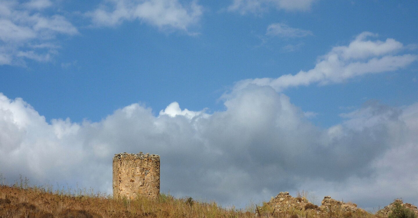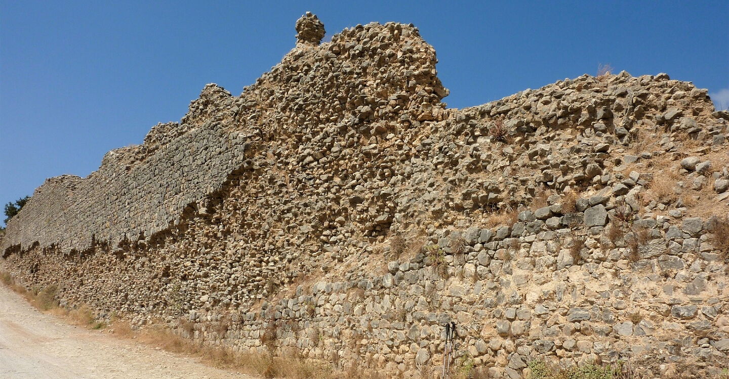Dort gehen wir links, direkt hinter der Leitplanke sofort wieder links und erreichen die 05 Antike Stadt Lyttos (616 m). Sie gehörte zu den ältesten und mächtigsten Städten auf Kreta – ein Erzfeind von Knossos. Geht man noch an der Kirche vorbei, dann rechts an den Weinreben ein kurzes Stück den Abhang hinunter, so findet man die Überreste. Wir gehen auf dem weiterführenden Weg an der Kirche Agios Georgios vorbei, über den Bergrücken und weiter in Richtung einzeln stehender Türme. Aber bevor wir diese erreichen, biegen wir halb links auf die Schotterpiste ab. Auf dem betonierten Stück gehen wir rechts und sofort wieder links, sodass wir die Hauptstraße in Littos erreichen. Wir folgen dieser in einem großen Halbkreis um das Dorf herum. In einer Rechtskehre mit einem Verkehrsspiegel verlassen wir die Hauptstraße nach links bergauf. Wir tangieren kurz die Hauptstraße und gehen nun direkt nach Kastelli hinunter und bis zum Dorfplatz vor, wo wir 100 m rechts gehen und der Ausschilderung zum Hotel folgen.