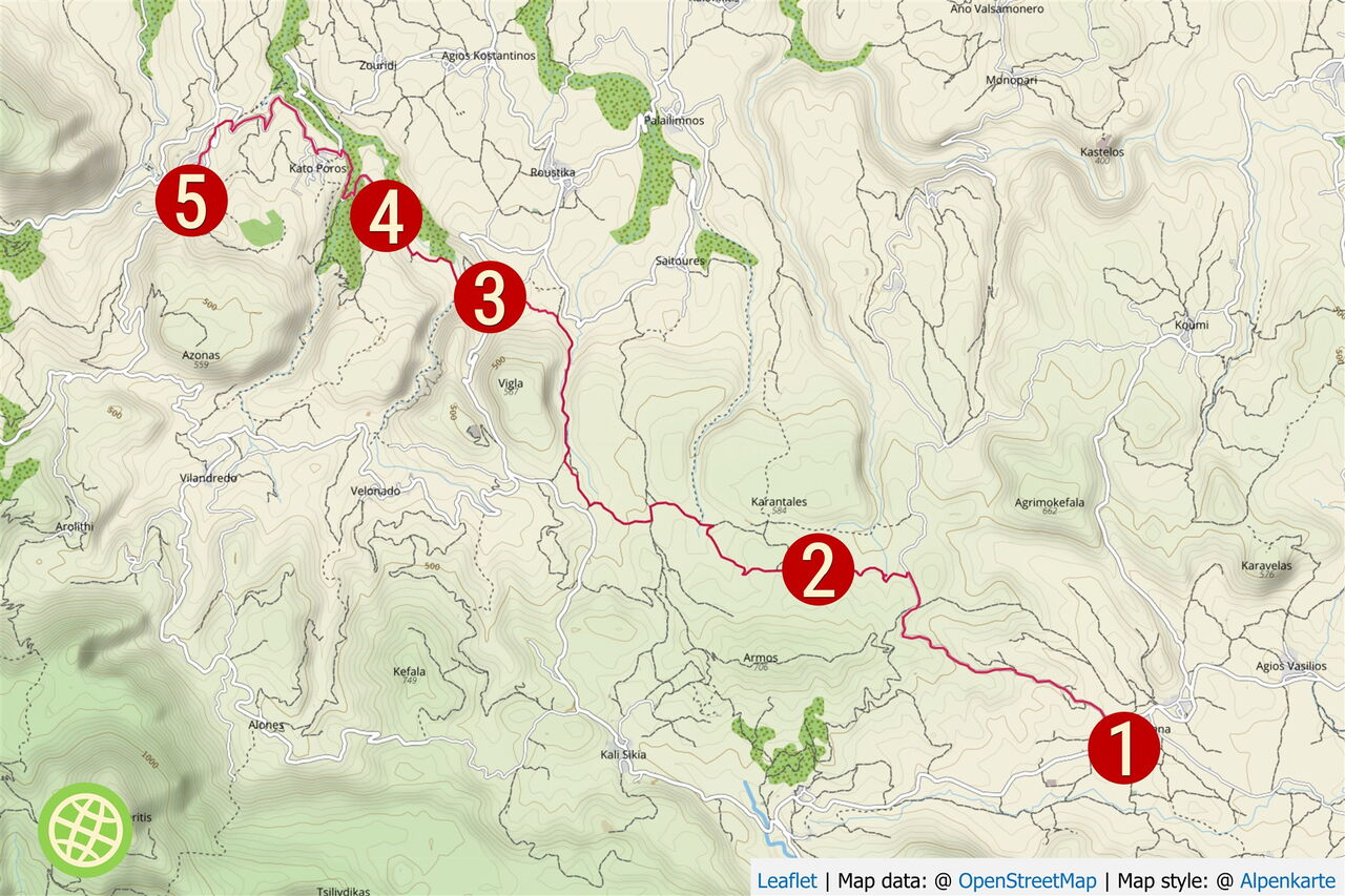 100 m nach einer scharfen Rechtskurve, hier befindet sich eine Leitplanke, biegt links ein schmaler, bergauf führender Pfad ab. Nach 180 m überqueren wir die Asphaltstraße und folgen weiterhin dem Pfad, der dann schlussendlich in die Hauptstraße mündet. Wie erreichen unser heutiges Etappenziel 05 Argiroupoli (280 m).