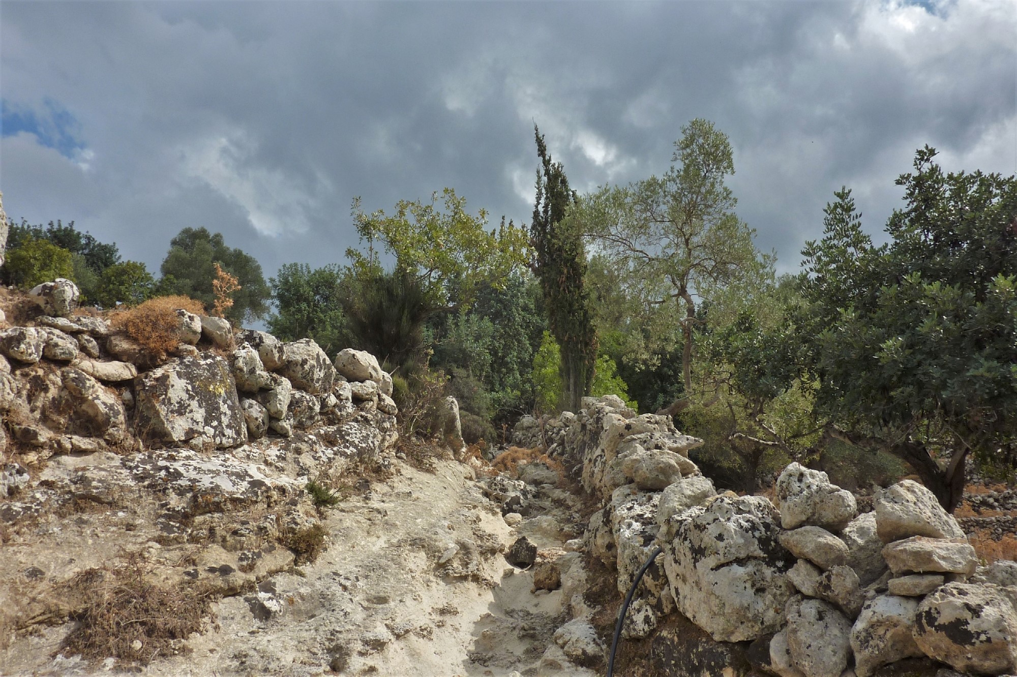 Wir folgen dem Wegweiser Richtung Ano Malaki, kommen im weiteren Verlauf an einer mit Steinen gepflasterten 02 Quelle (519 m) vorbei und überqueren eine Bergkuppe. Wir sehen rote Pfeile, die nach links weisen. Der Ausschilderung folgen wir auf der Schotterpiste Richtung Saitouris. Nur kurz später umlaufen wir ein schattiges Waldstück. Nach einer scharfen Rechtskurve endet unsere Piste und wir gehen links durch eine kleine Senke, rechts führt ein Bachbett in die Schlucht. Auf der Anhöhe ignorieren wir den linken Abzweiger. Wir treffen auf zwei aufeinanderfolgende Weggabelungen, an denen wir jeweils links gehen, um dann nach einem kurzen Anstieg, ca. 150 m, rechts weiterzuwandern. Bei der darauffolgenden Dreiwegegabelung gehen wir geradeaus weiter. Unsere Piste endet und wir gehen rechts, bis die Piste sich gabelt und wir halb links durch das Dickicht gehen. Diese Piste endet und auf einer weiteren Piste gehen wir rechts durch die Schlucht.