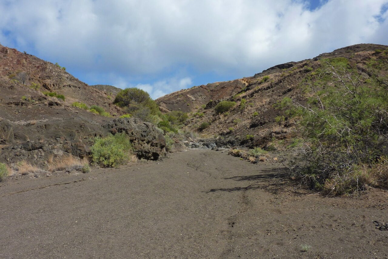 Wir steigen in das Barranco hinab und befinden uns unterhalb der (02) Caseria Cubada (128 m). Zwischen dem Barranco mit Palmen und einer hohen Steinmauer verläuft der Wanderweg ein kurzes Stück rechts. Im weiteren Verlauf geht es über die Terrassenfelder bis zu einer Weggabelung. Wir steigen links direkt im Barranco auf, bis wir auf eine Betonplatte treffen, die mit einem Steinmännchen markiert ist. In westlicher Richtung - oberhalb der links von uns liegenden Häuser - macht der Pfad nach 300 m eine Rechtskurve. Wir erreichen ein großes Wasserauffangbecken, an dem wir rechts in das breite und sandige Barranco steigen.