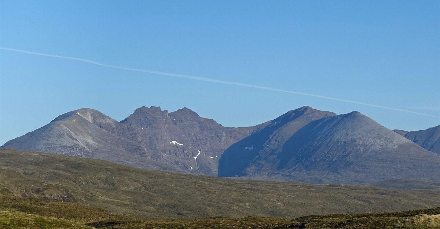 In einem Halbkreis gehen wir um den links von uns liegenden Hügel zur Einsattelung zwischen dem Glas Mheal Mor und dem Bidein a' Ghas Thuill mit seinen flachen Sandsteinplatten. Von dort steigen wir dann direkt auf dem felsigen Grat oder auf einem der vielen gerölligen Pfade, die sich durch den steilen Berghang ziehen, bis zum Gipfel des 02 Bidein a' Ghas Thuill (1062 m) auf. Dies ist der höchste der beiden Munros von An Teallach. Es ergibt sich eine 360°-Rundsicht, aber automatisch schaut man gebannt Richtung Südwesten, wo sich ein spektakuläres und einmaliges Panorama auf den Nachbargipfel Sgùrr Fiona und die kleinen Felsspitzen des Corrag Buidhe bietet – die wohl eindrucksvollste Aussicht in den schottischen Bergen.