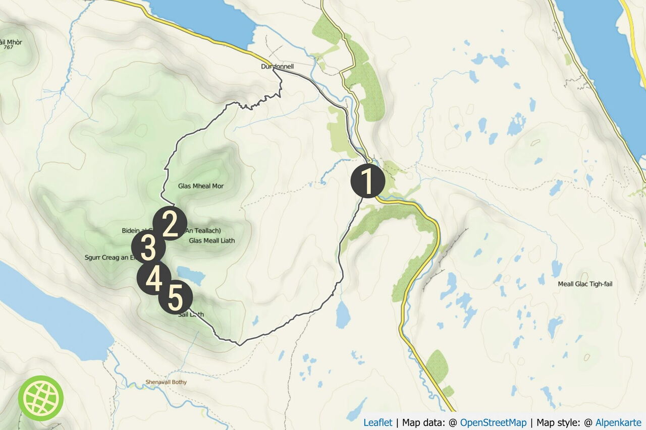 Wieder auf dem Pfad geht es noch ein kurzes Stück zur Einsattelung herunter, um dann auf den vorletzten und im weiteren Verlauf schlussendlich auf den letzten Gipfel, den 05 Sail Liath (954 m) (kein Munro), zu klettern. Vom Sail Liath fällt zunächst ein breiter Bergrücken in südöstlicher Richtung ab. Sobald der Pfad nur noch schwer auszumachen ist, orientieren wir uns in Richtung eines großen Steines mit einem darauf platzierten Steinmännchen. Hier steigen wir Richtung Osten ab, um einen steilen Hang zu umlaufen. In dieser Steinwüste ist die Orientierung nicht einfach, auch wenn vereinzelte Steinmännchen vorhanden sind. Bei dem nachfolgenden Abstieg orientieren wir uns in Richtung eines Wanderweges, der sich von Süd nach Nord durch die Talsohle zieht. Wir gehen halb links auf diesem Pfad weiter, bis dieser in eine Fahrzeugspur mündet, die bis zur A832 führt.