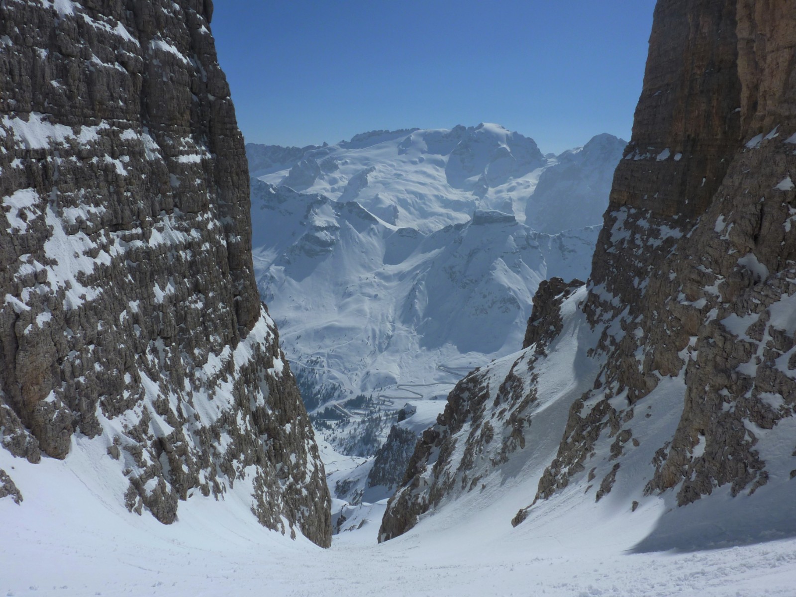 An der südöstlichen Flanke des Piz Boè fahren wir zum Einstieg ins nicht zu verfehlende Val de le Fontane, von wo man traumhafte Ausblicke auf die Marmolada und bis hinunter auf die Straße hat.