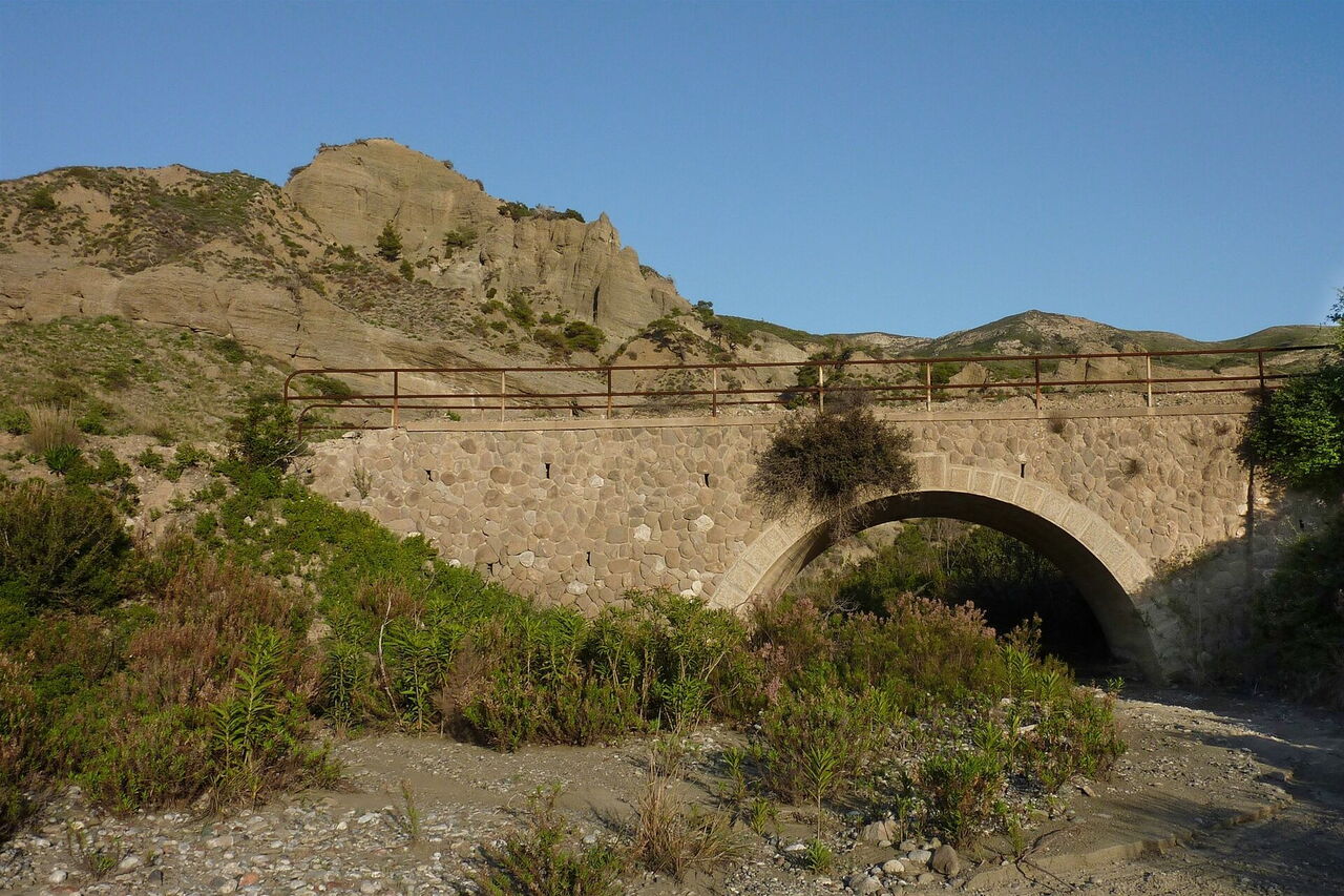 Auf der Piste angekommen, gehen wir rechts bergab. Wir bewegen uns dabei langsam durch sehr lange Kehren. Einen (05) linken Abzweiger ignorieren (231 m) wir und schon bald überqueren wir eine Brücke, die von den Italienern während der Besatzung gebaut wurde. Vorbei an Olivenhainen erreichen wir unseren Parkplatz.