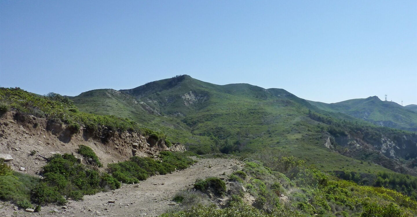 Wir passieren zwei Ziegenzäune und gehen nun in direkter Linie auf den zu besteigenden Berg und die dahinter liegenden Windräder zu. Wir erreichen die (02) Einsattelung (342 m) und können Richtung Westen und Osten das Meer ausmachen. Ein Steinmännchen markiert den Aufstieg auf dem Bergrücken in Richtung der Windräder. Auf einem gut ausgetretenen Ziegenpfad übersteigen wir schnell den ersten und den zweiten Hügel.