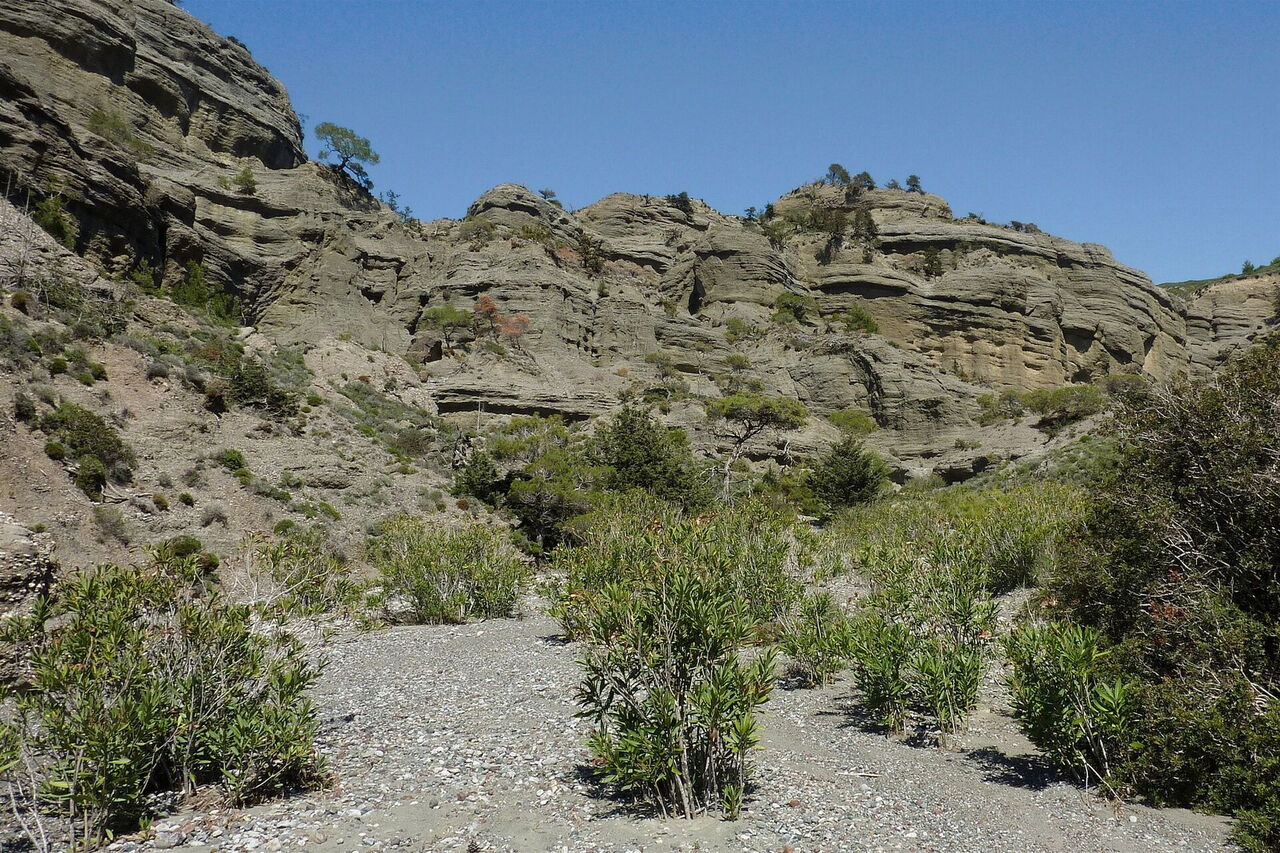 Vom (01) Start und Ziel (159 m) oberhalb von Arnitha gehen wir ein kurzes Stück auf der Schotterpiste zurück, biegen dann rechts bei der Weggabelung Richtung Quelle Vodi ab und überqueren das Trockenflussbett. Den folgenden rechten Abzweiger parallel entlang des Flussbetts lassen wir liegen. Nach einem guten Stück Aufstieg gabelt sich der Weg, vor uns liegt ein Olivenhain. Hier gehen wir auf dem rechten Arm weiter bergauf. Bei einem Zaun und einer Blechhütte gehen wir halb rechts und kurz später bei der Wegegabelung mit dem Steinhaufen erneut halb rechts.