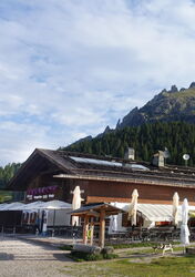 Danach mündet der Lehrpfad wieder in eine Schotterpiste und kurz vor der Straße folgen wir dem halb rechts weiterführenden Wanderweg 37. Dieser bringt uns zur 04 Fermata Ponticello (1.493 m) (Bushaltestelle Brückle) mit einem großen Parkplatz und dem dahinterliegenden Gasthof Brückle. Kehren wir nicht ein, so gehen wir an der Straßenschranke vorbei, über die nachfolgende Brücke und verlassen danach die Straße nach halb rechts, um auf dem Wanderweg 37 weiterzugehen.