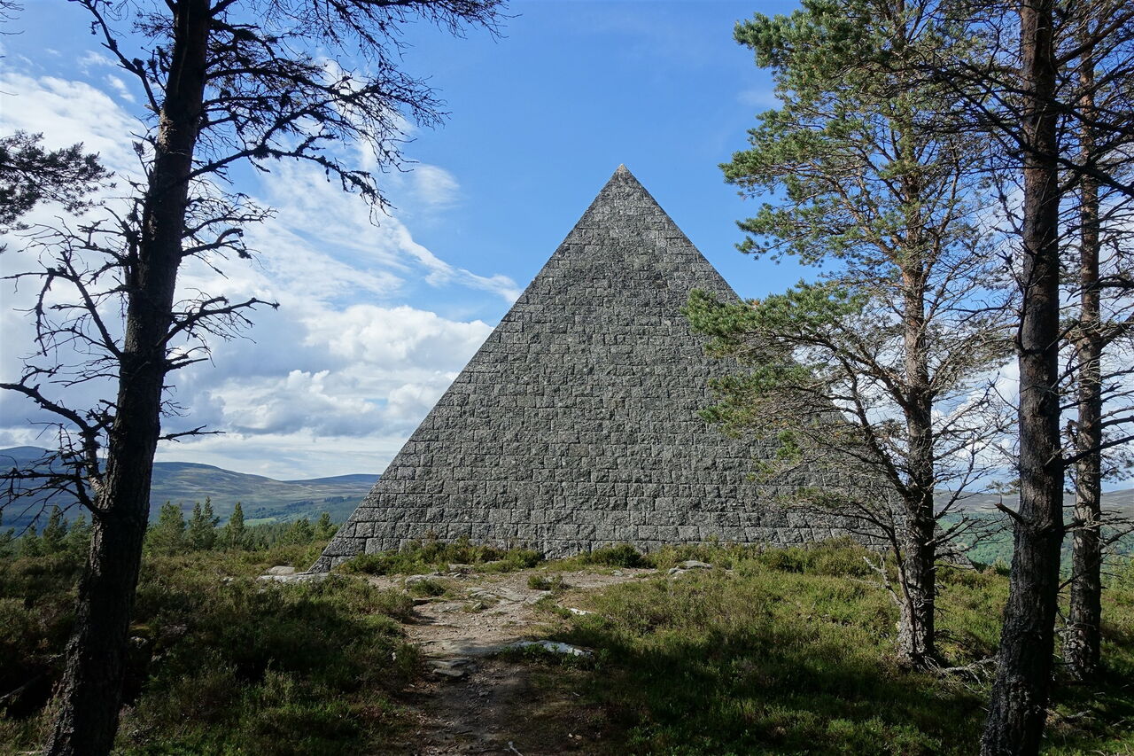 Der weiterführende Pfad endet an einer Forststraße, wir gehen rechts bis zu einer Weggabelung vor. In dieser Senke gehen wir halb links, queren eine Forststraße und gehen geradeaus bergauf durch ein Gatter. Einen rechten Abzweiger, der im weiteren Verlauf über eine kleine Stahlbrücke führt, ignorieren wir, gehen aber nach 20 weiteren Metern steil links. Auf einem unscheinbaren bergauf führenden Pfad erreichen wir den Princess Helena's Cairn (3). Er erinnert an die Heirat zwischen Prinz Friedrich Christian Karl August von Schleswig-Holstein-Sonderburg-Augustenburg und Prinzessin Helena Lenchen – sie war das fünfte Kind der britischen Königin Victoria – am 5. Juli 1866. Wir gehen auf dem Pfad zurück und dann auf dem Hauptweg links weiter und erreichen den links oberhalb liegenden Princess Louise's Cairn (4) – sie war das sechste Kind der britischen Königin Victoria. Der Stein erinnert an ihre Heirat mit John George Edward Henry Douglas Sutherland Campbell, 9. Duke of Argyll oder einfach Marquis of Lorne von 1871. Nach weiteren 200 m befindet sich auf der rechten Seite der 1852 errichtete Steinhaufen Ballochbuie Purchase Cairn (5). Er erinnert an den Kauf des Balmoral Castle und der Ländereien durch Queen Victoria und Prince Albert am 15. Mai 1878. Seitdem gehört das Schloss zum Privatvermögen der königlichen Familie. Bei einer Weggabelung gehen wir halb rechts und erreichen den 03 Prince Leopold's Cairn (374 m) (6) – er war das achte Kind. Der Cairn erinnert an die Heirat von Leopold mit der deutschen Prinzessin Helene zu Waldeck und Pyrmont am 27. April 1882. Durch diese Heirat wurde sie ein Mitglied der britischen Königsfamilie. Von hier hat man einen gigantischen Blick auf das Balmoral Castle – ein sehr selten gesehenes Fotomotiv.