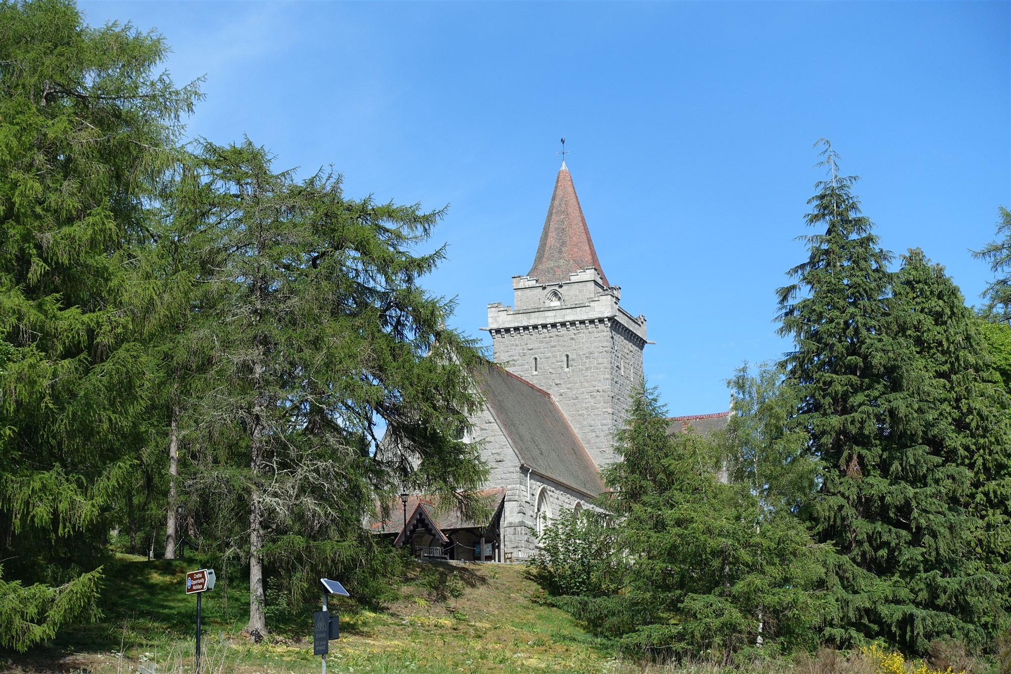 Wir gehen über den kostenpflichtigen Parkplatz in der kleinen Ortschaft Crathie Richtung Ballater. Auf Höhe des Souvenirladens befindet sich links oberhalb die 01 Crathie Kirk (274 m), wir gehen dort rechts auf der Asphaltstraße herunter. Im weiteren Verlauf ignorieren wir den rechten Abzweiger zum Friedhof und gehen bis zum Ende der Straße. Dort gehen wir dann rechts, halten uns hinter der Suspension Bridge über den Fluss Dee rechts, biegen nach weiteren 80 m links ab und nehmen dann die zweite Straße links – die erste führt zur Royal Lochnagar Distillery. Unser Weg führt an malerisch gelegenen Cottages vorbei.