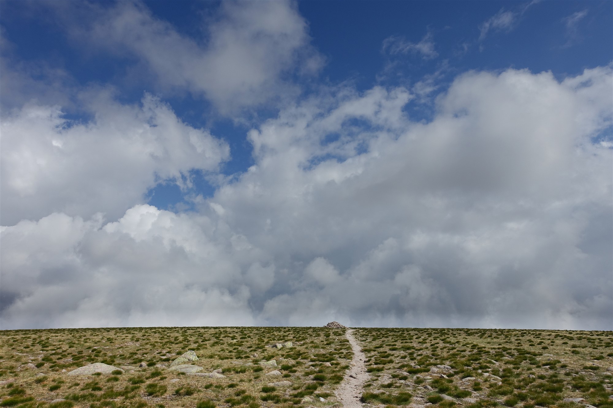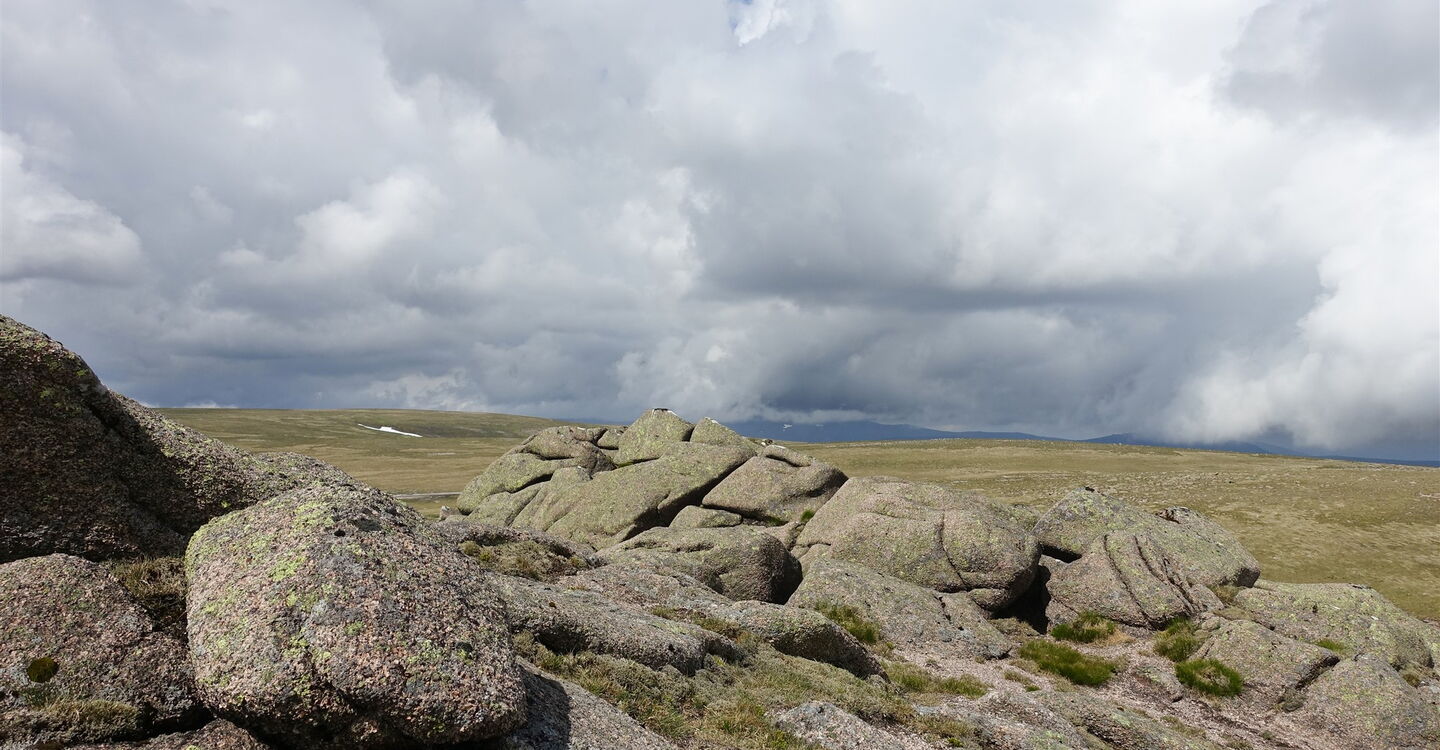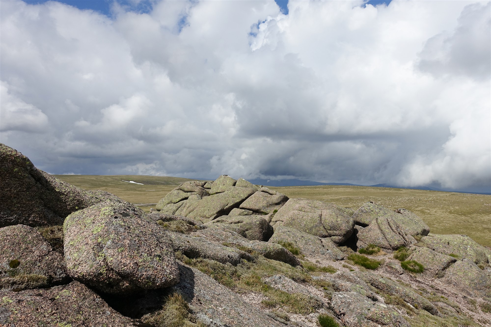 Rechts von uns erhebt sich der Gipfel des Beinn A Bhuird South Top. Bei Kilometer 9,4 kommen wir an einem kleinen, mit Steinen aufgeschichteten Windschutz vorbei. Unterhalb des Bergrückens, der die Nordspitze mit der Südspitze verbindet, sind beide Wege an der Gabelung zielführend. Oberhalb der rechts unterhalb liegenden Einsattelung erreichen wir den Bergrücken, der über sehr flaches Gelände Richtung Gipfel ansteigt. Im östlich gelegenen Kar liegt malerisch der Loch Dubh Lochan. Auf einer Mischung aus Grasboden, feinen Kieselsteinen und platt geschliffenen Steinen geht es auf einem nur schwer auszumachenden Pfad bis zum Gipfel des 03 Beinn A Bhuird North Top (1196 m) – ein Munro. Auf den benachbarten Plateaus ragen beeindruckende und mächtige Granitpyramiden aus der Ebene heraus.
