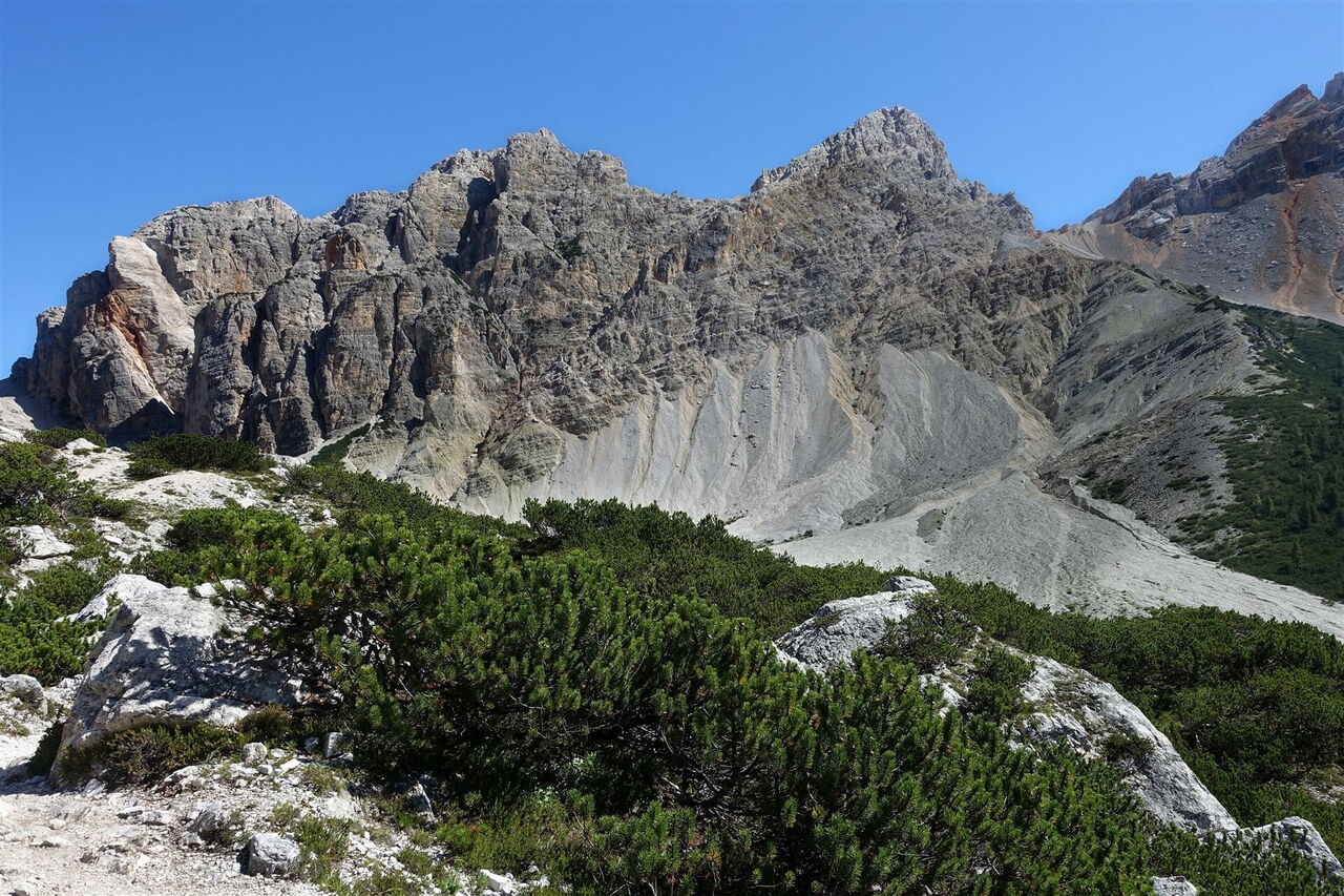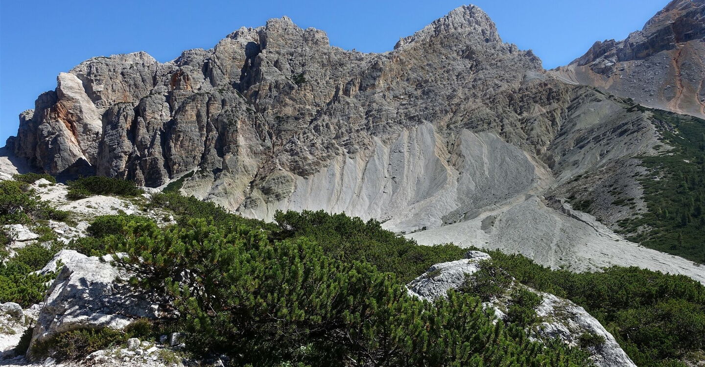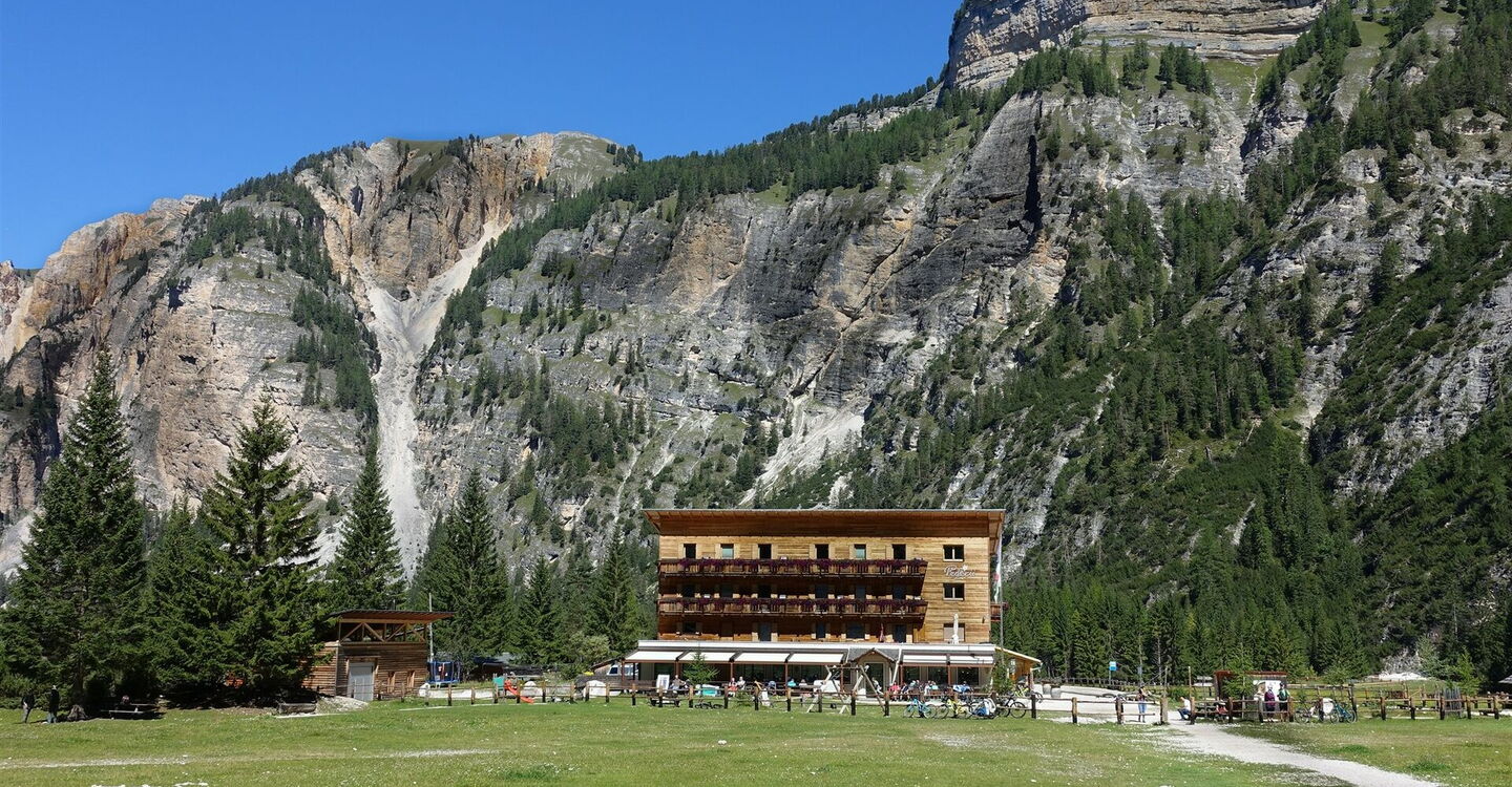 Vom 01 Berggasthaus Pederü (1.545 m) gehen wir ca. 100 m auf dem Kieselsteinweg (Wanderweg 7) in südliche Richtung, bevor wir den Bachlauf über eine Brücke queren. Dahinter gehen wir links und marschieren durch Latschenkiefern bergauf, weiterhin auf einem Kieselsteinweg. Zwischenzeitlich überqueren wir eine Schotterpiste, die bis in das Hochtal des Fanes-Sennes-Prags-Naturparks führt. Alternativ kann man auch auf der Schotterpiste bergauf gehen, die nachfolgende Beschreibung gilt für den kürzeren und schöneren Wanderweg. Der nachfolgende Pfad ist mit Holzpfosten befestigt, da der komplette Hang abgerutscht war.