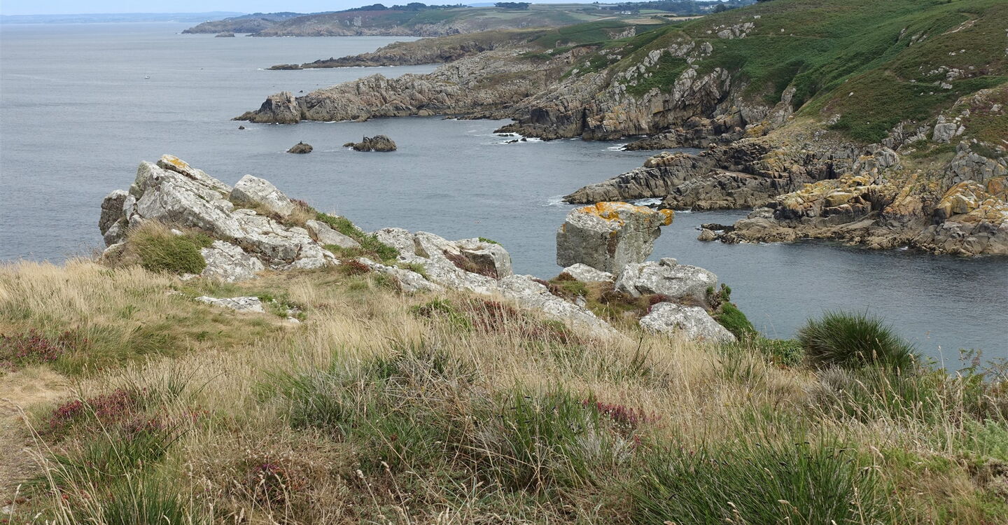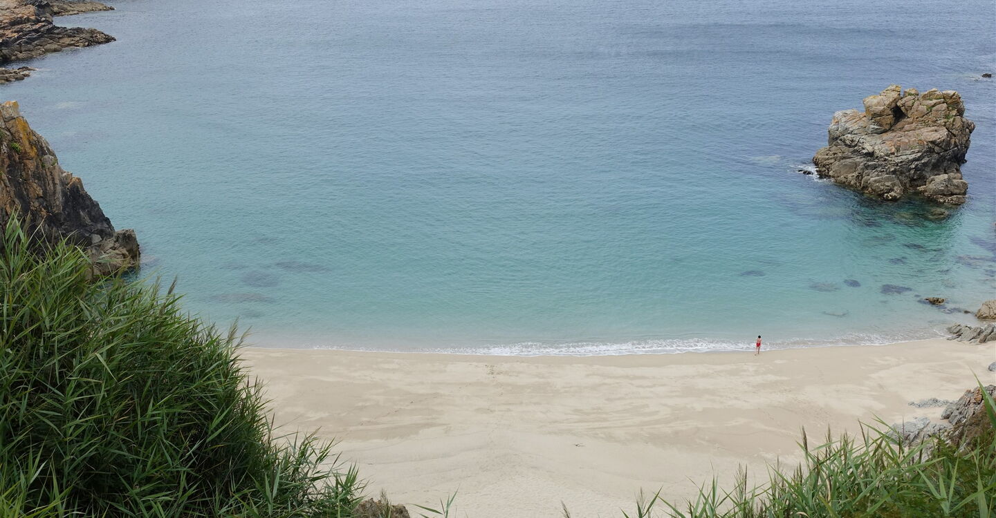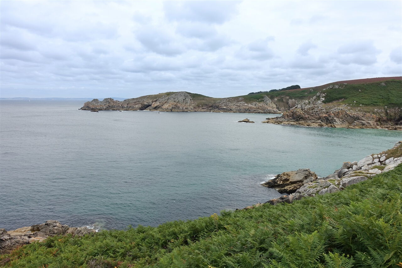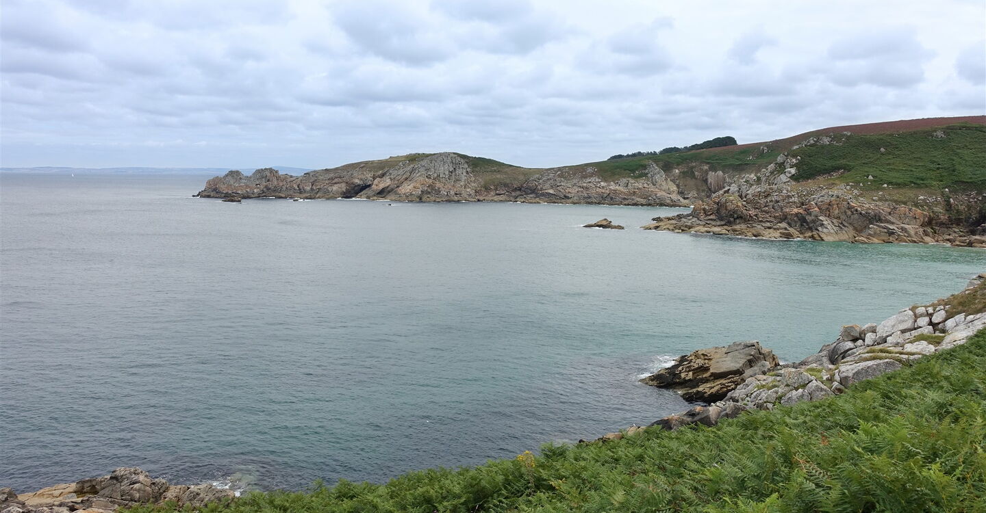 Auf dem Zöllnerpfad geht es weiter Richtung Osten. Mehrere Bachläufe werden überquert, bevor wir die traumhaft versteckte Bucht am 04 Plage de Trénaouret (32 m) entdecken, sie liegt kurz vor der nachfolgenden Landzunge Pointe de Trénaouret. Hinter den Überresten von Steinmauern haben wir eine weitere Landzunge umlaufen und blicken nun in das weite Rund einer Bucht, auch einen goldgelb strahlenden Sandstrand können wir ausmachen. Nach einem kurzen Abstieg zu einer Slipanlage erfolgt ein Aufstieg und wir gehen an dem links unterhalb liegenden Plage de Pors-Kiol vorbei.
