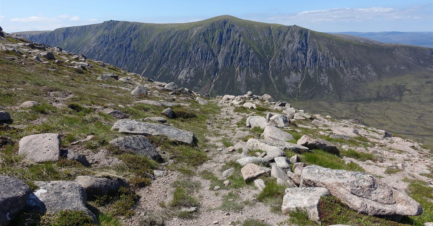 Nach 8,5 km allmählicher Annäherung beginnt nun endlich der richtige Aufstieg, der zunächst recht steil ist. Dabei ergeben sich wunderschöne Fernblicke in die Bergwelt der Cairngorms. Ein Pfad ist immer gut auszumachen und nach einem kurzen Abstieg erreicht man das flache Gipfelplateau des 03 Sron Na Lairige (1184 m). Es folgt ein kurzer Abstieg zu einer Einsattelung, um dann auf dem zunächst breiten Grat des Braeriach aufzusteigen.