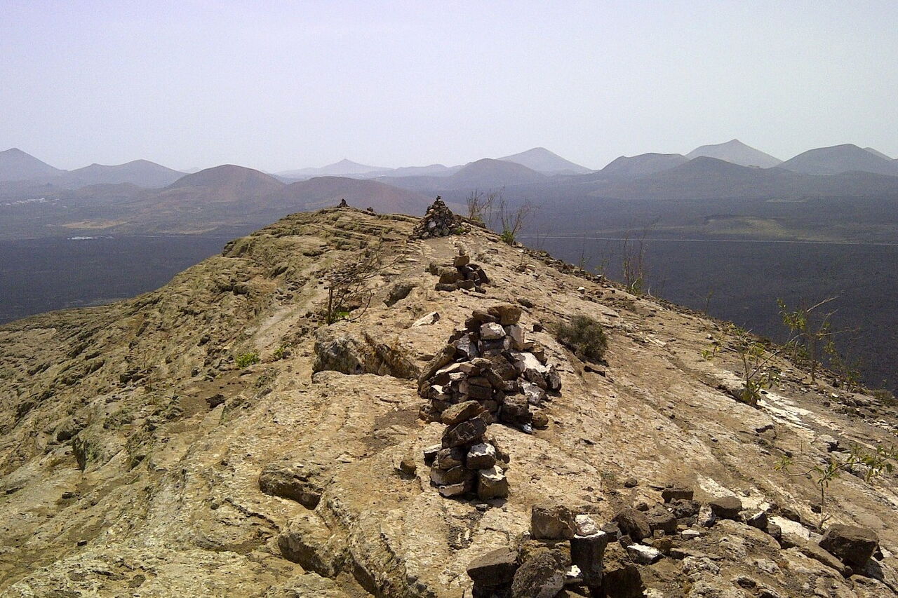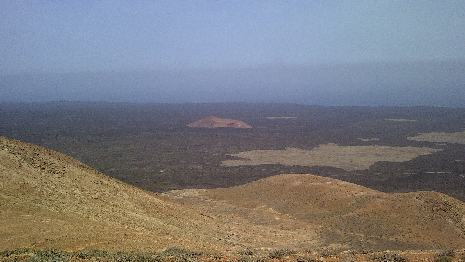 Von hier aus beginnen wir die Rundwanderung auf dem Krater gegen den Uhrzeigersinn. Schnell gewinnen wir an Höhe, bis wir schlussendlich den Gipfel der (03) Caldera Blanca (458 m) erreicht haben. Vom Gipfel aus ergibt sich eine grandiose Aussicht auf die Lavaströme, die es bis zur Nordküste geschafft haben. Richtung Osten erkennen wir den Ort Mancha Blanca und in der Ferne das Risco-de-Famara-Gebirgsmassiv sowie in südlicher und westlicher Richtung die vielen Vulkankegel des Timanfaya-Nationalparks.