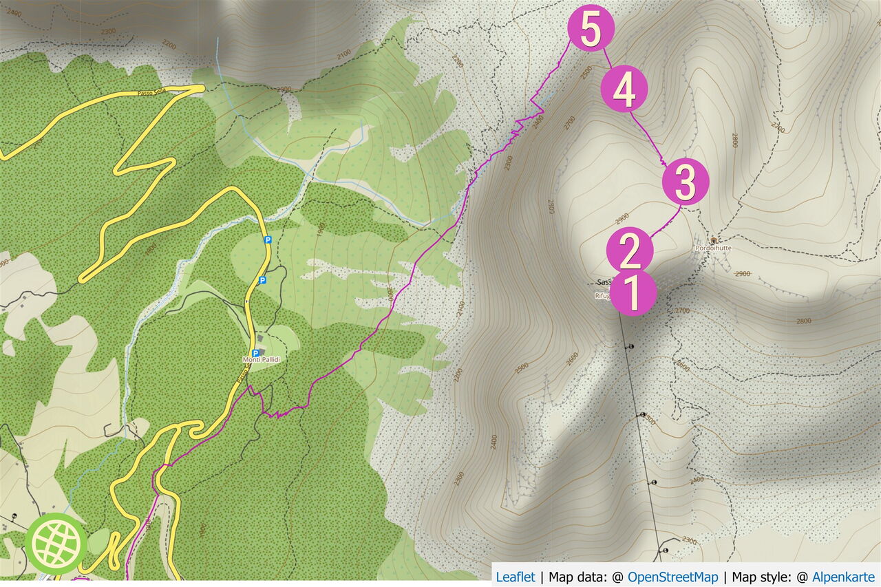 Geokoordinaten zum Start 46.473683 11.774667. Sie führen Dich nach Canazei, wo Du das Auto parkst und mit dem Lift weiterfährst.