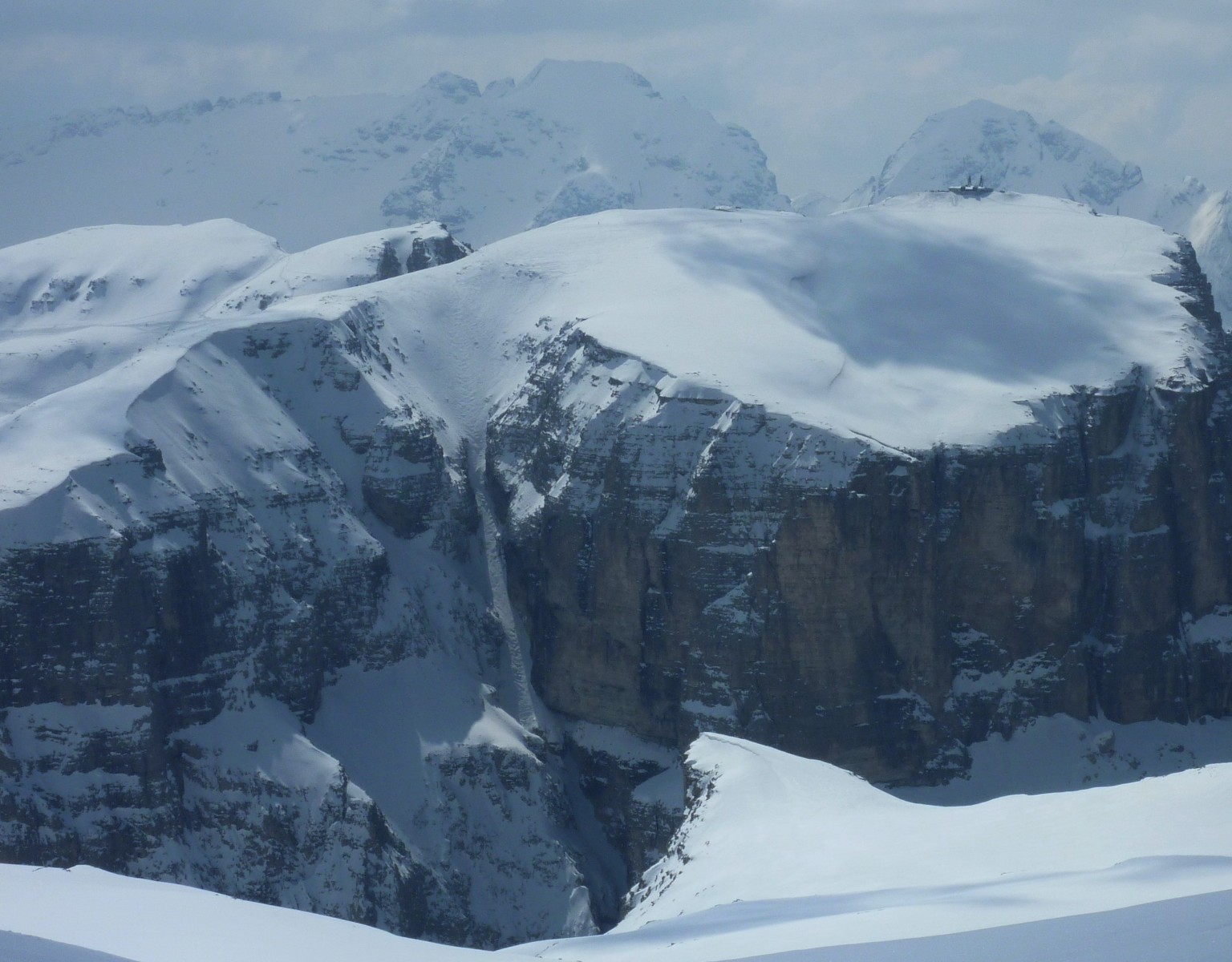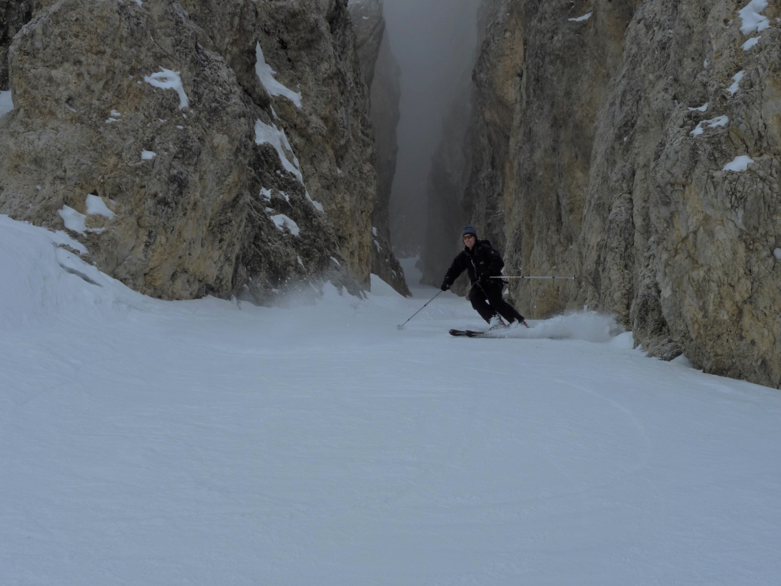 Mein GPS hat in der Scharte versagt. Aber einmal drin, gibt es keinen anderen Weg mehr als hinunter. Die Abfahrt führt über einen Nordhang. Folgende Ausrüstung wird empfohlen: Produkte für alpine Sicherheit im Schnee, Freerideski, Klettergurt mit 20m Kletterseil, Steigeisen und Pickel und Skitourenhelm. Es empfiehlt sich die Einkehr in das Rifugio Maria bei der Bergstation, welches nach Maria Piaz, der Pionierin des Tourismus am Pordoipass, benannt wurde. Beste Jahreszeit: Januar bis April. Uns erwarten kurze Stücke mit bis zu 50° Hangneigung.