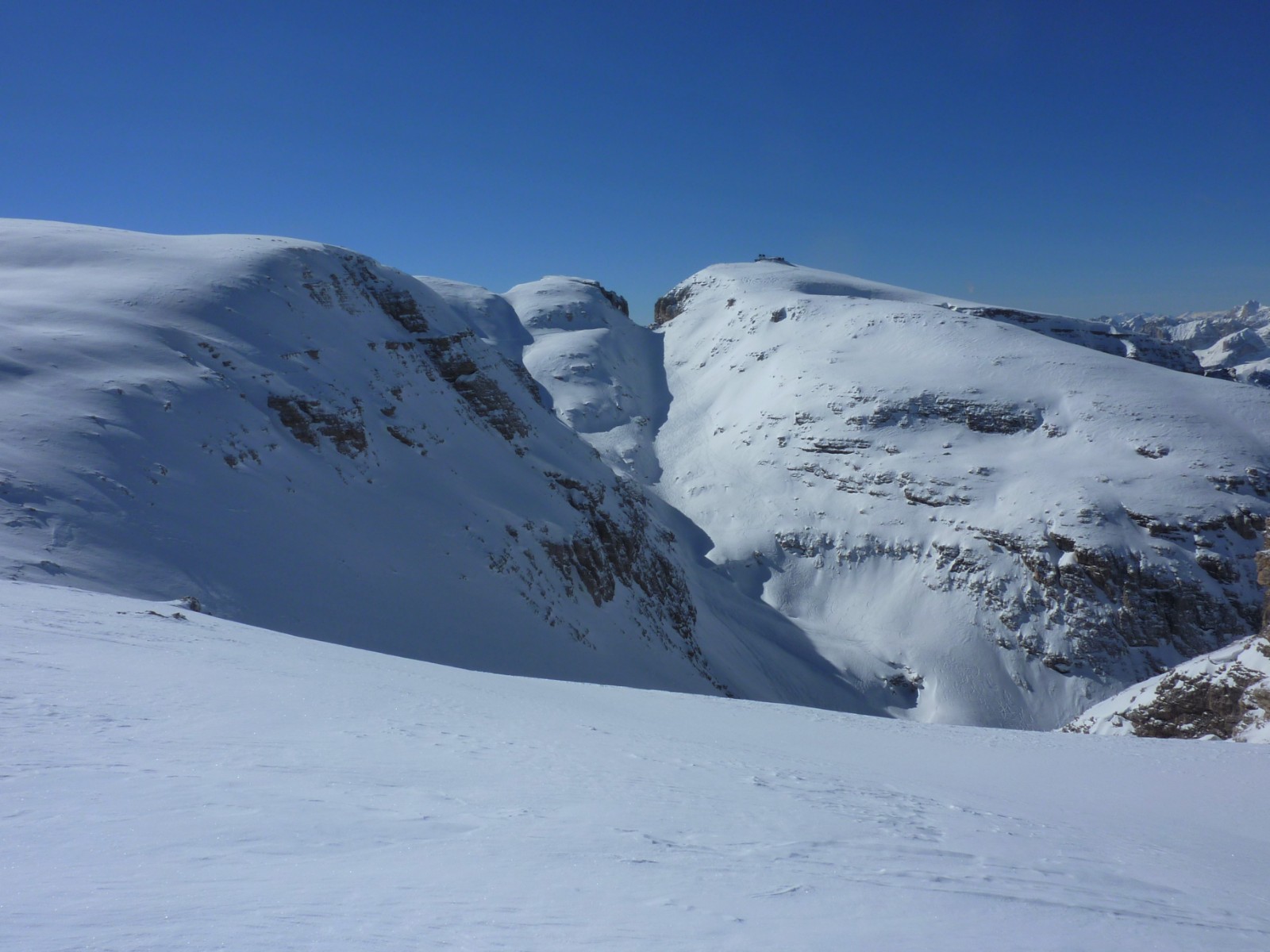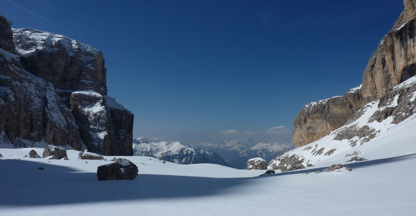Wenn noch keiner die Strecke gefahren ist, ist die Orientierung ab den Latschenkiefern nicht so einfach. Die Abfahrt führt über einen Nordhang und Westhang. Folgende Ausrüstung wird empfohlen: Produkte für alpine Sicherheit im Schnee, Freerideski und Skitourenhelm. Es empfiehlt sich die Einkehr in das Rifugio Maria bei der Bergstation, welches nach Maria Piaz, der Pionierin des Tourismus am Pordoipass, benannt wurde. Beste Jahreszeit: Januar bis April. Uns erwarten kurze Stücke mit bis zu 35° Hangneigung.