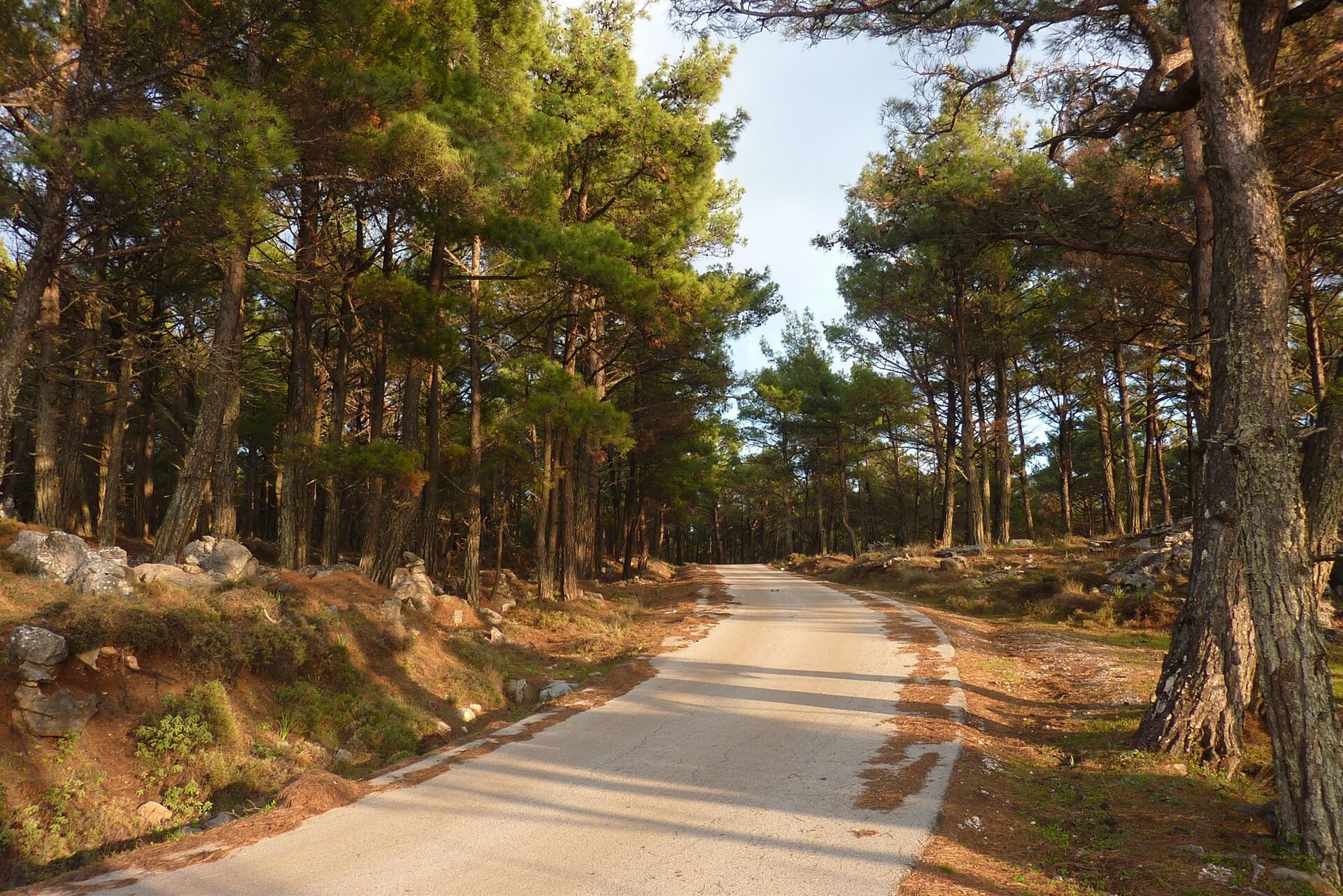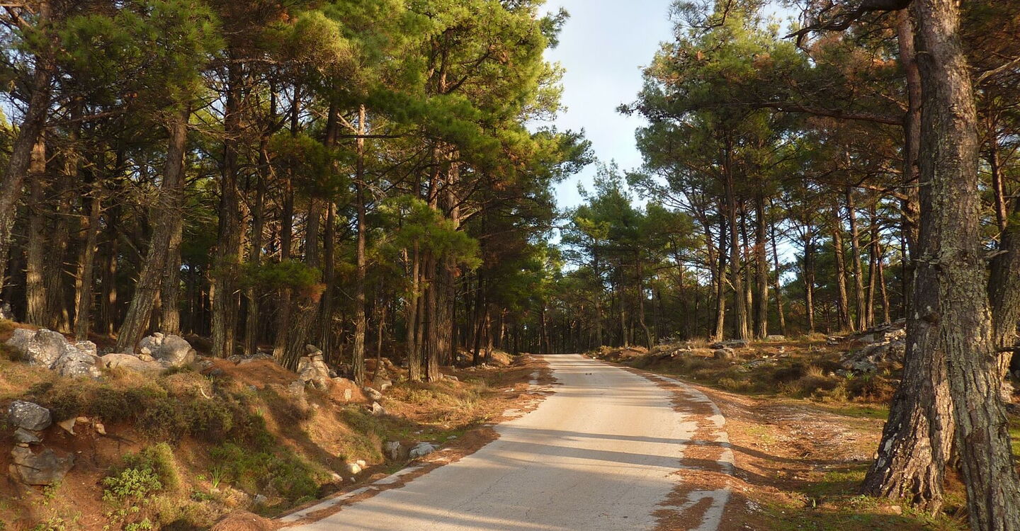Der Canyon ist inzwischen zu einem zahmen Bachlauf geworden. Rechts führt der Bachlauf unterhalb der Felsen durch eine Rechtskehre, von links mündet ein kleinerer Bachlauf in den Hauptstrom. Hier befindet sich der (05) Ausstieg (508 m). Wir klettern zu dem links einmündenden Bachlauf hinauf und folgen wie Detektive seinem Lauf, der durch den dichten Kiefernwald führt. Inzwischen schwer auszumachen, gabelt sich der Bachlauf. Hier folgen wir ihm durch die Linkskurve, um dann nach nur 100 m rechts bergauf zu gehen und nach weiteren 150 m die Asphaltstraße zu erreichen. Auf dieser gehen wir links vor, bis wir freien Blick auf die Ägäis haben und die Straße eine Rechtskehre macht. Links von uns befindet sich ein Hang, den wir pfadlos heruntergehen. Büsche und Sträucher erschweren das Vorankommen, bis wir an einer 5-7 m hohen, unüberwindbaren Klippe oberhalb der Straße ankommen. Wir gehen links an dieser Klippe entlang. Im folgenden Waldstück gibt es eine Abstiegsmöglichkeit zur Straße. Auf der Straße gehen wir links bis zum geparkten Pkw zurück.