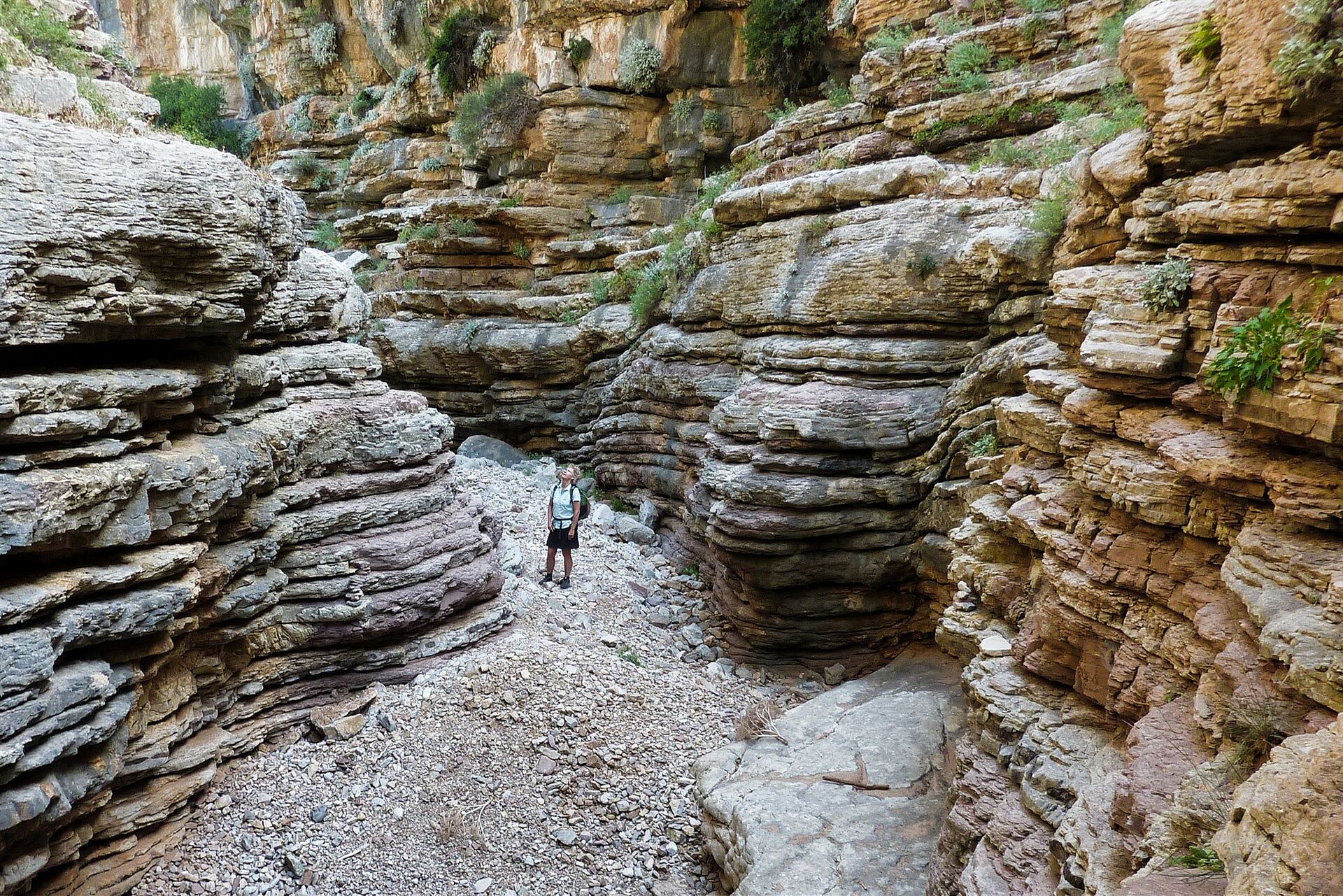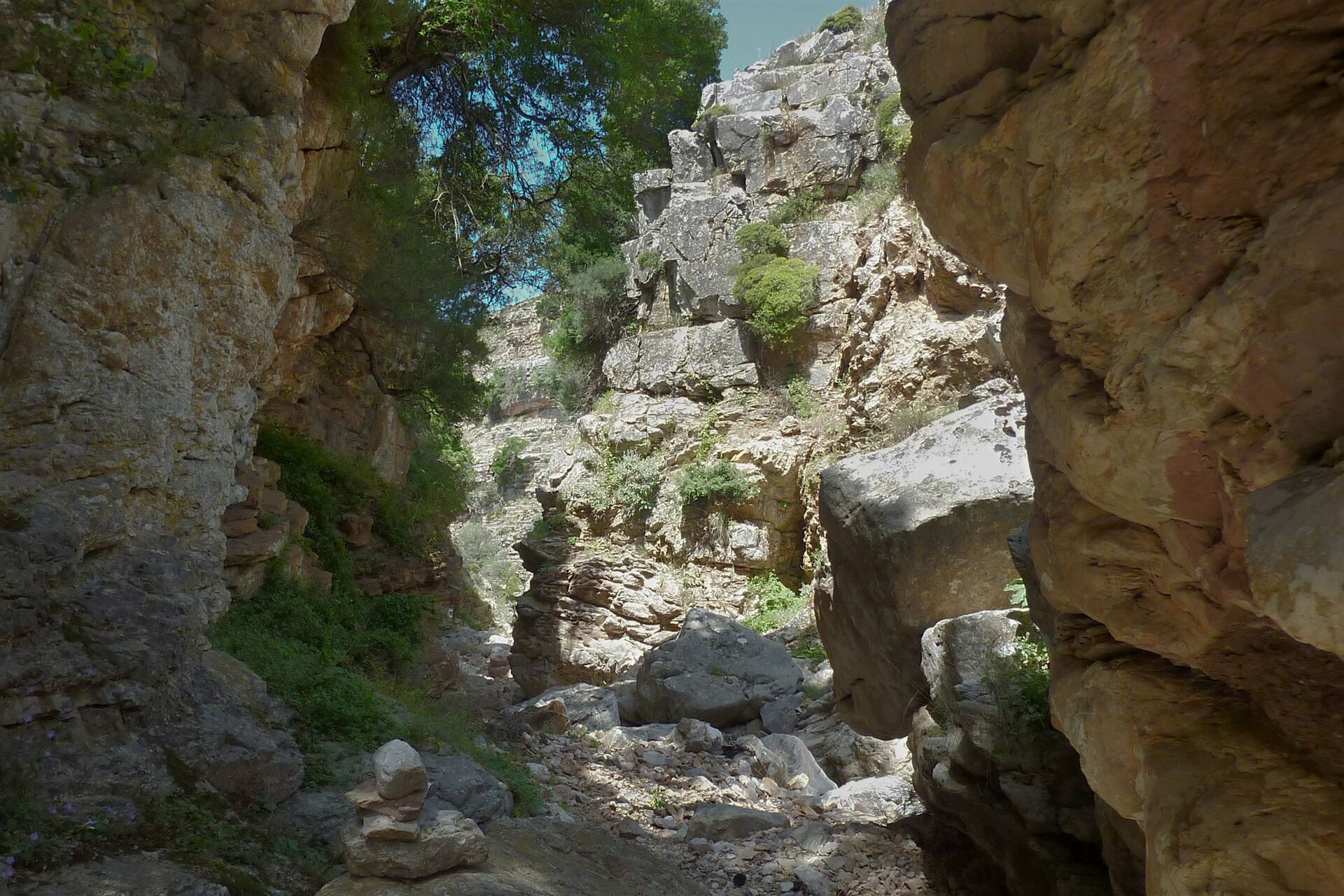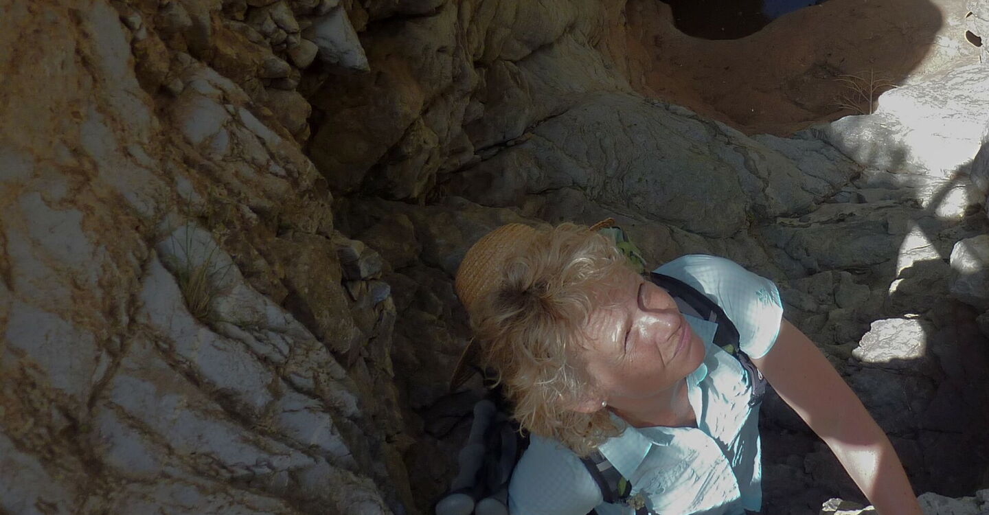 Das landschaftsprägende Attaviros-Gebirgsmassiv im mittleren Westen von Rhodos hat zwei mächtige Schluchtausläufe. Vom Hauptgipfel, dem Attaviros, endet der längste Schluchtauslauf, Richtung Osten, unterhalb des Dorfes Agios Isodoros. Richtung Westen, zwischen dem Attaviros-Hauptgipfel und dem Nebengipfel Voskotopi, schlängelt sich der Canyon Plouma Richtung Meer – unser heutiges Projekt. Aber diese Durchwanderung des Canyons, bei der man eigentlich mehr am Klettern als am Wandern ist, erfordert unsere vollste Aufmerksamkeit und ist sehr schweißtreibend. Auf der Wanderung erzählt die Natur die schönsten Geschichten: eine eindrucksvolle Schlucht mit bis zu 200 m senkrecht aufsteigenden Felswänden, den stufenförmig geschichteten Gesteinsschichten und einem nur 3 m engen Nadelöhr.
