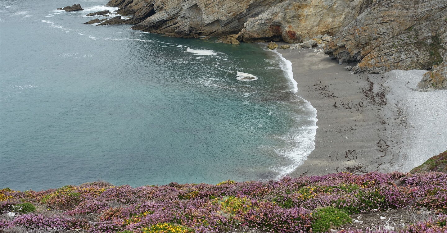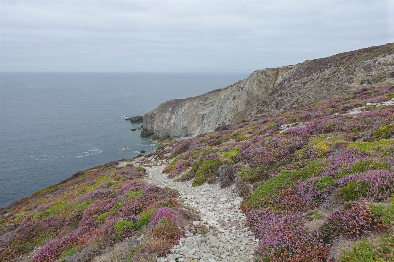 Auf einer spektakulären Streckenführung erkunden wir das Cap de la Chèvre, eine Landzunge am südlichen Ende der Halbinsel Crozon. Die Landschaft wechselt zwischen bis zu 100 m hohen Klippen, lichten Kiefernwäldern und blühenden Heideflächen, die von Ginster unterbrochen werden. Durch die sich ständig verändernden Wassertiefen und den wechselnden Meeresuntergrund aus Sand, Kieselsteinen und Fels ergeben sich besondere Farbnuancen im Atlantischen Ozean. Man spürt förmlich die Nähe des Golfstroms, in geschützten Buchten findet man eine mediterran anmutende Flora. Es ergeben sich wunderbare Ausblicke über die Baie de Douarnenez bis zur gegenüberliegenden Landzunge Sizun. Bunker als stumme Zeitzeugen der Kriegsgeschichte sowie ein beeindruckendes Denkmal für die Flieger der französischen Marine lassen uns innehalten. Ein Weg der Langsamkeit.