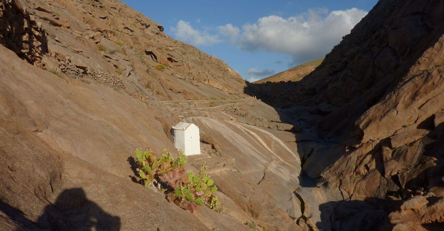 Nach einem weiteren Kilometer haben wir bereits links von uns liegende Terrassenfelder hinter uns gelassen. Das Barranco gabelt sich und ein Arm führt unter der Hauptstraße durch – wir folgen dem linken Flusslauf. Wir passieren Terrassenfelder und laufen auf dem Pfad durch das Barranco de Mal Paso direkt auf die imposant vor uns stehenden Basaltformationen zu. Bald erreichen wir eine Verzweigung, an der drei Barrancos zusammenfließen. Wir gehen dort einige Meter in das linke Barranco herein, um dann aus ihm herauszusteigen und auf dem mit Steinen gesäumten Weg in einer langen Rechtskehre die (05) Wallfahrtskirche (159 m) zu erreichen. Wir steigen noch bis zur Dammkrone auf und gehen dann links an einem der größten Tamariskenwälder Fuerteventuras vorbei, zunächst parallel zum Flusslauf, dann im Flusslauf, bis wir wieder zum Ausgangspunkt gelangen.