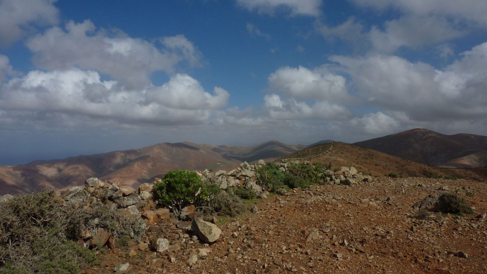 Nach 1,8 km erreichen wir einen Vorgipfel und gehen an der Grundstückbegrenzungsmauer entlang. Nach einer Einsattelung treffen wir abermals auf einen Ziegenzaun, übersteigen diesen aber nicht, sondern gehen parallel unterhalb des zweiten Gipfels herüber zum (02) Pico Palmito (673 m). Frei nach dem Motto, die schönsten Aussichtspunkte liefert oftmals die Natur selbst, genießen wir die Fernsicht. Schaut man in westliche Richtung zum Atlantischen Ozean, so kann man sogar das in der Wanderung 17 beschriebene Felstor ausmachen.