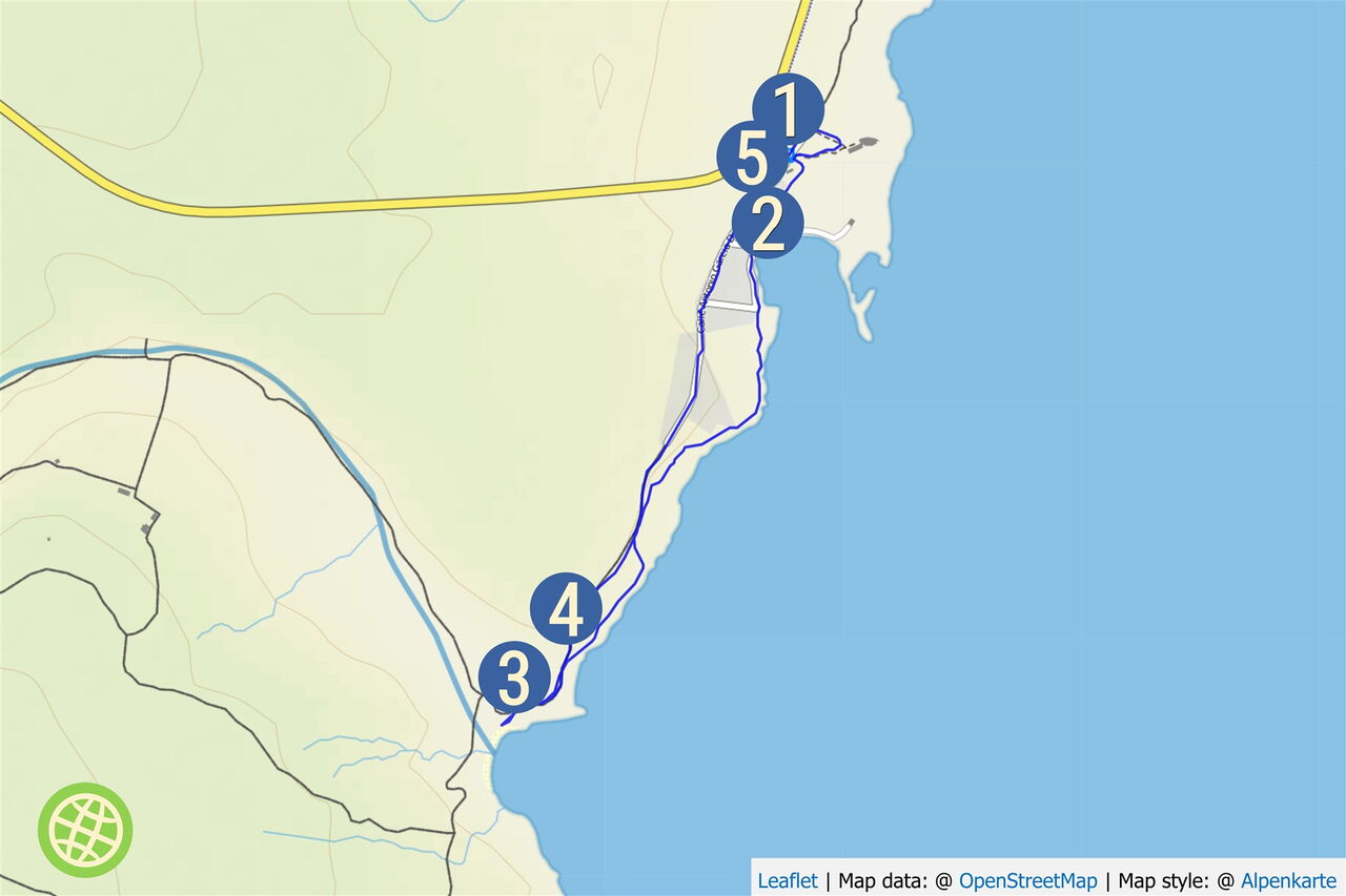 Zurück führt der Weg in nördliche Richtung auf der Schotterpiste. Früher befand sich in dieser geschützten Bucht ein kleiner Hafen. So konnte der Kalk gleich an seinen Bestimmungsort verschifft werden. Beim (04) Blick auf die Bucht (9,1 m) kann man dies nur noch erahnen.