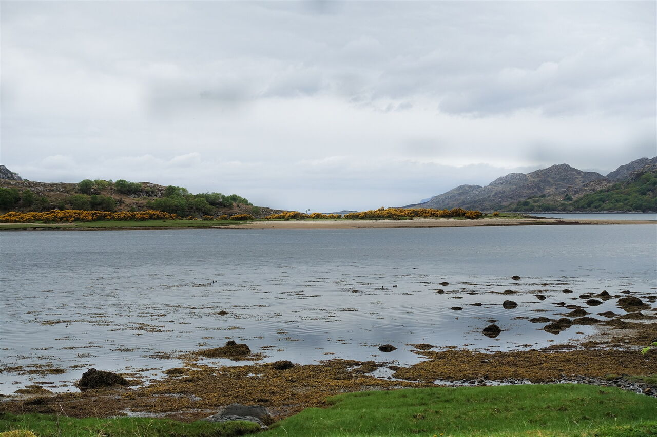 Während des Abstiegs gehen wir bei der Weggabelung halb rechts, links unterhalb sehen wir Ruinen. Der Pfad endet oberhalb des Loch Moidart, wir gehen links auf dem sogenannten 04 Silver Walk (16 m) weiter. Der Silberweg erhielt seinen Namen von einem Schatz aus elisabethanischen Münzen, die während des Baus dieses wunderschönen Küstenpfads gefunden wurden.