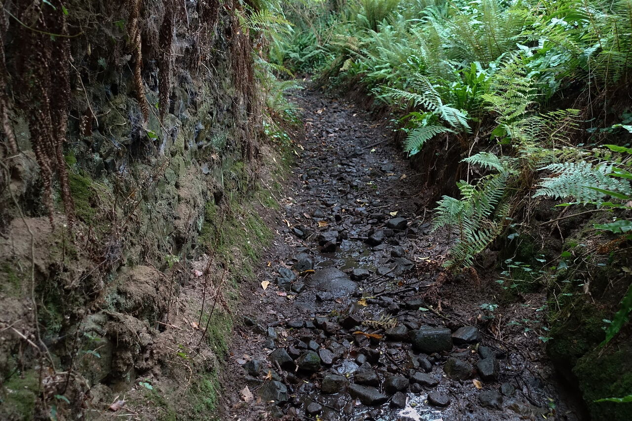 Aufgrund der windgeschützten Lage in diesem Flusstal konnte der ursprüngliche Wald mit seinen Baumriesen bestehen. Einmal mündet der Weg in die Straße, aber nach wenigen Metern biegen wir wieder rechts auf einen Pfad ab und erreichen den 03 Port de la Roche-Jagu (4 m). Hier an den Ufern des Flusses Trieux befindet sich ein kleiner Anleger für Ausflugsboote. Direkt oberhalb des Anlegers verlässt ein schmaler Pfad die Bucht und man gelangt auf einen breiteren Weg, dem wir nun oberhalb des Flusslaufes folgen.