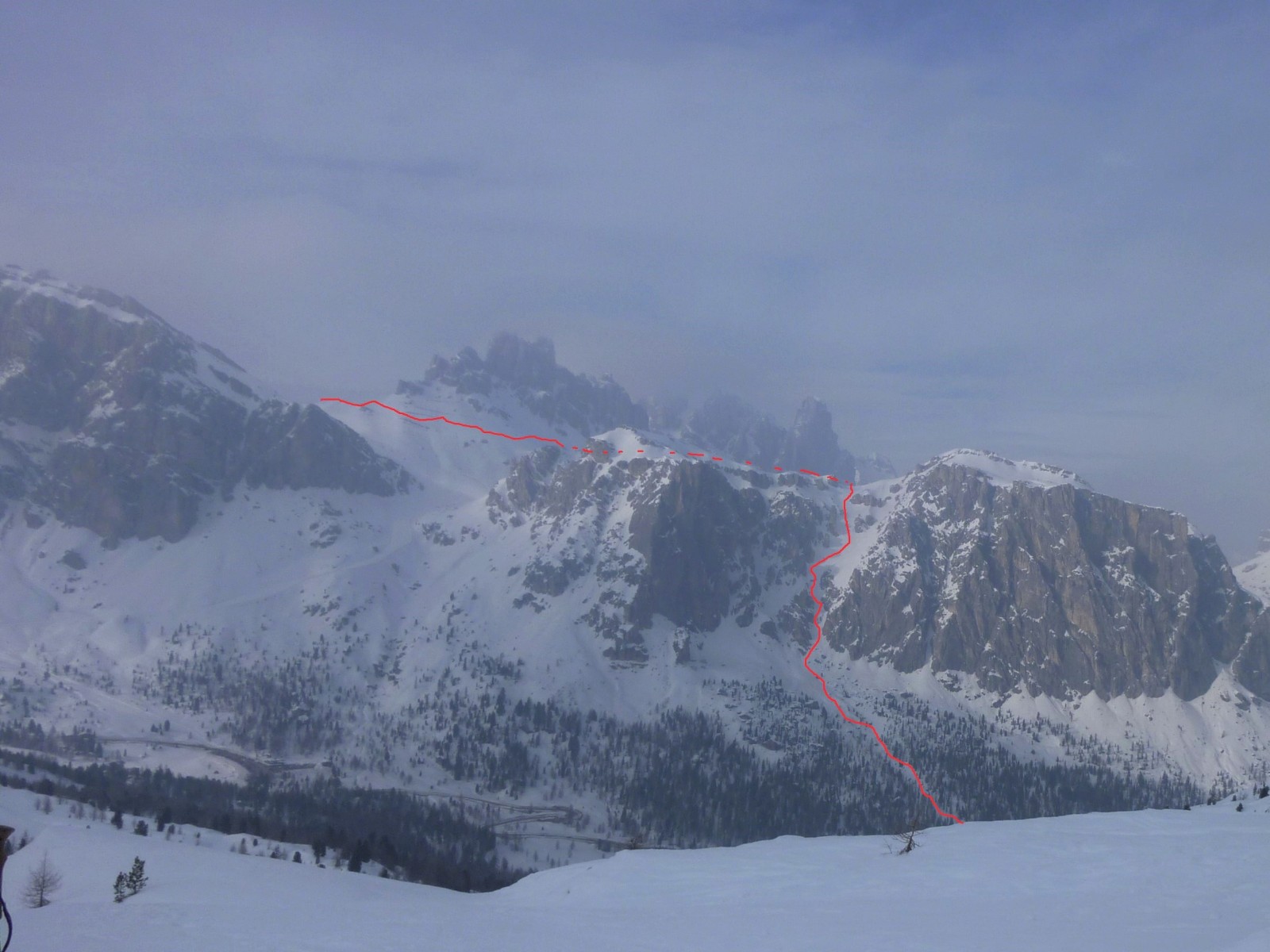 Vor uns liegt eine hervorragende Variantenabfahrt zwischen den Spitzen der Lagzuoi Torries, die bei Firnschnee, wie an unserem Tag, ein großartiges Erlebnis ist. Am unteren Ende treffen wir auf eine Forststraße.