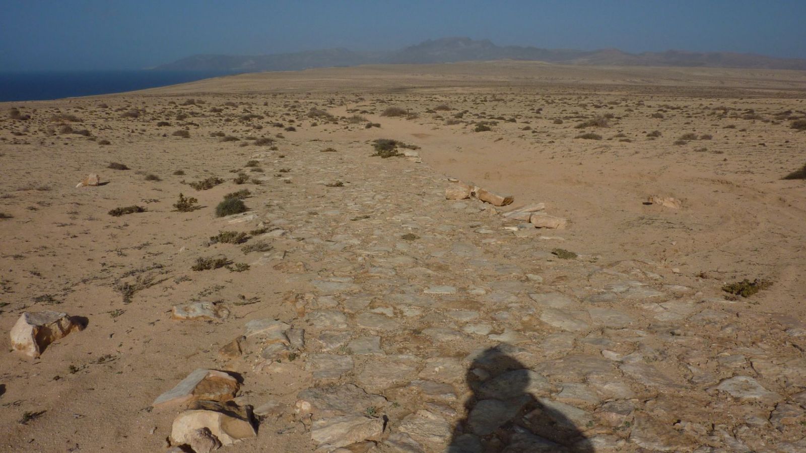 Auf dem Plateau angekommen, orientieren wir uns an einem türkisfarbenen Holzpfeiler, der am ca. 130 m entfernten Hauptweg steht. Dort gehen wir rechts, um nach 270 m – 25 m vor dem zweiten Holzweiler – links über den Sandhaufen zu steigen und auf dem schwer auszumachenden Pfad weiterzuwandern. Im weiteren Verlauf queren wir drei Sandpisten, bis bei der nächsten Kreuzung rechts von uns – in 15 m Entfernung – ein Metallpfeiler steht. Hier gehen wir nun links, verlassen diesen Weg aber bereits nach 125 m wieder. Stattdessen gehen wir nun weglos auf ein Steinmännchen und einen in der Entfernung gut erkennbaren Wegweiser der Inselregierung zu. Wir sehen die Überreste eines alten (05) Pflasterwegs (117 m) und gehen hier 150 m nach links, um dort wieder rechts zu laufen. Nachdem wir die rechts von uns liegenden Windräder passiert haben, gehen wir bei der nächsten Gelegenheit links, um nach weiteren 125 m rechts auf der breiten Piste am Absperrzaun der Autobahn anzukommen. Von dort sind es noch ca. 500 m bis zum Parkplatz.