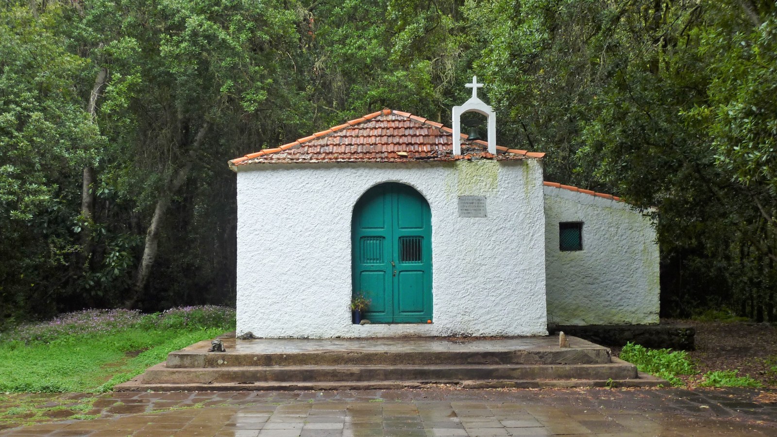 Bereits nach einigen Metern verlassen wir die Fahrstraße nach links und erreichen die (04) Ermita de Lourdes (969 m). Vom kleinen Kirchplatz führt halb links ein Weg direkt zum Weiler El Cedro - dies ist die Variante, um den Wasserstollen zu umgehen. Wir gehen jedoch auf dem etwas erhöhten Weg in nördliche Richtung weiter durch den Nebelwald, um bei der Fahrstraße rechts zu gehen und den folgenden Abzweiger nach rechts zu ignorieren. In einer scharfen Rechtskurve verlassen drei Wanderwege die Fahrstraße nach links. Wir begehen den rechten dieser Wege Richtung Hermigua und steigen zunächst durch den Wald ab.