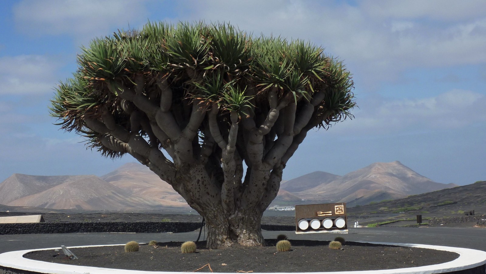 Von dem Platz mit dem großen Drachenbaum in (01) La Geria (319 m) gehen wir zunächst in östlicher Richtung auf der LZ-30. 150 m hinter der Bodega Stratvs - mit wunderschönen alten Eukalyptusbäumen - biegen wir rechts, bei einem weißen Haus mit grüner Tür, in die Straße mit schwarzem Lavagranulat ein. Die nachfolgende Einfahrt nach rechts mit den 2 weißen Pfosten lassen wir liegen und passieren eine gelb angemalte Finca, die links von uns liegt.