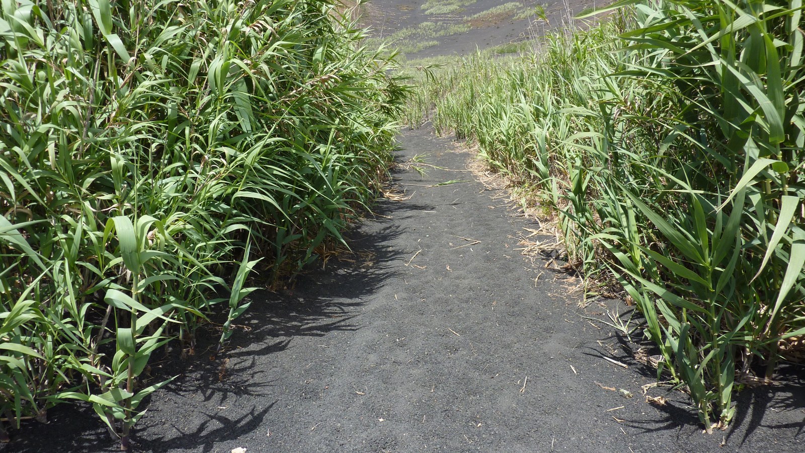 Nach einer kleinen Anhöhe zweigt bei einem halbhohen Wegweiser der Inselregierung (02) (361 m) rechts ein Weg an einem weißen Haus mit grauer Tür ab. Der Weg geht nun steil bergauf und das weiche Lavagranulat erschwert das Gehen. Nach 340 m endet der Weg und wir gehen rechts für weitere 500 m, bis wir zu einem vereinzelt stehenden Haus auf der linken Straßenseite kommen. Hier verlassen wir den Hauptweg hinter uns und gehen rechts in südliche Richtung. Bereits nach 50 m nehmen wir den Abzweiger nach rechts und gehen an einem verlassenen Haus vorbei. Der Weg führt uns nun in Richtung vereinzelt stehender Palmen, die etwas erhöht im vor uns liegenden Hang stehen.