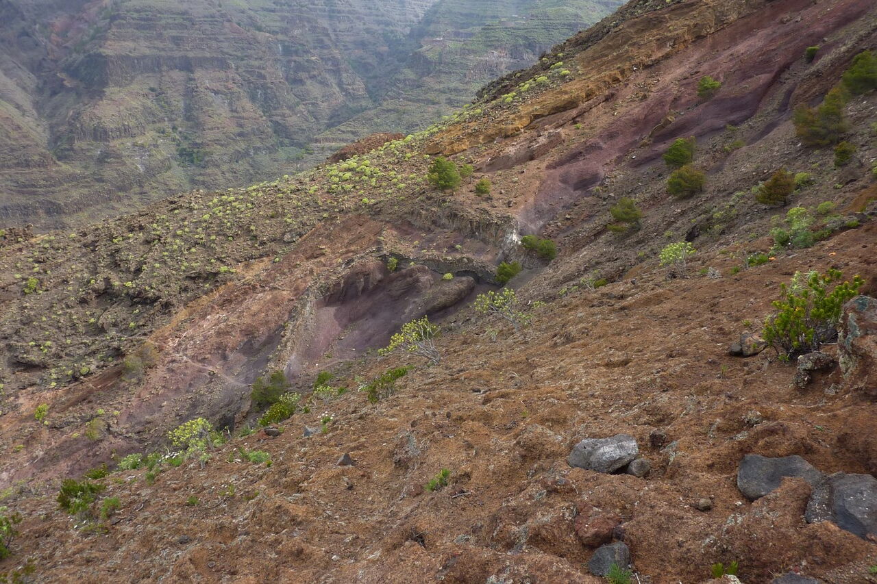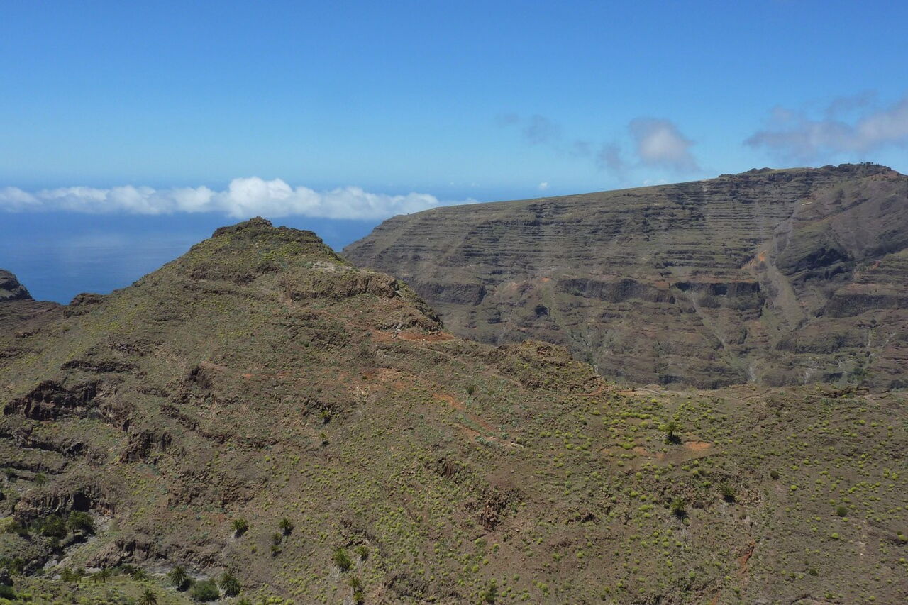 Der Einstieg zum Lechepfad ist nicht einfach zu finden. Nach 500 m stehen wir unterhalb eines großen Felsvorsprungs, der nachfolgende Weg führt in engen Kehren bergauf. Wir treffen auf ein weiß-rotes Kreuz auf einem Stein und einige Meter weiter auf ein durchgestrichenes rot-weißes Kreuz, abgesperrt durch Steine. Hier zweigt rechts der (02) Lechepfad (379 m) ab. Da der Pfad schwer auszumachen ist, sind rote Punkte - aber nur auf dem ersten Drittel des Weges - eine essenzielle Orientierungshilfe. Vereinzelte Steinmännchen markieren zusätzlich den Pfad. Nach einer ockerbraunen Schichtwand überqueren wir einen Bergrücken und haben nun freien Blick auf das untere Valle Gran Ray, bis hin zur Nachbarinsel El Hierro. Auf dem nachfolgenden Stück queren wir eine riesige Erosionsrinne mit einigen grünen Tupfern; das sind Kiefern, die noch nicht in den Abgrund gerissen worden sind.