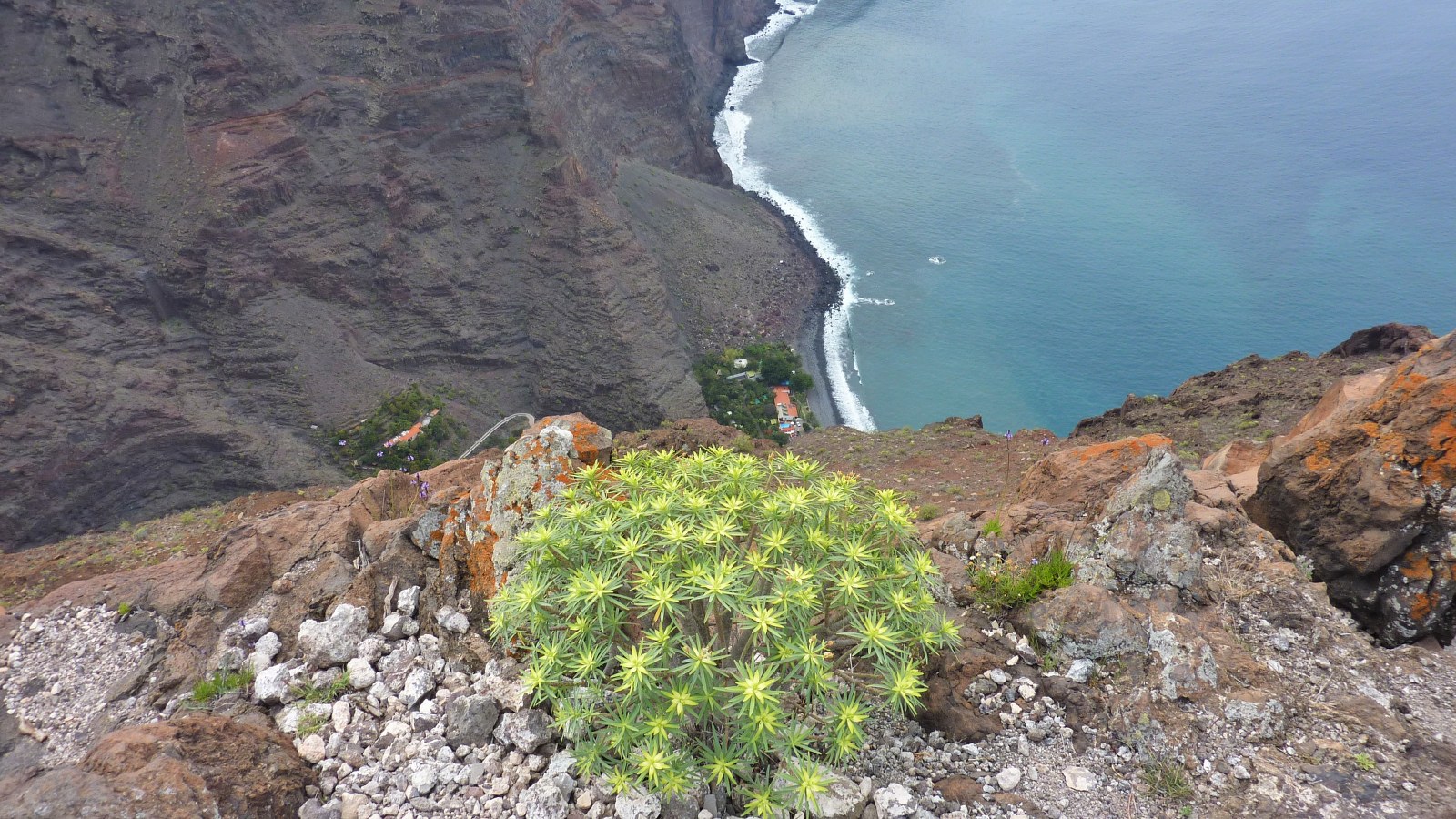 Wir gehen 350 m auf dem gleichen Weg bis zur Einsattelung zurück, um dann links über das Plateau auf einem beginnenden Pfad direkt an den Grat zu gelangen, wo sich uns ein gigantischer (04) Blick in das Valle Gran Rey (590 m) bietet. Auf unserem weiteren Weg gehen wir in gebührendem Abstand oberhalb dieser Klippe bergauf Richtung Las Pilas. Auf dem letzten Stück umlaufen wir den Las Pilas in einer 180-Grad-Kehre, bis wir auf die erste Ruine mit Dreschplatz vom Hinweg treffen.
