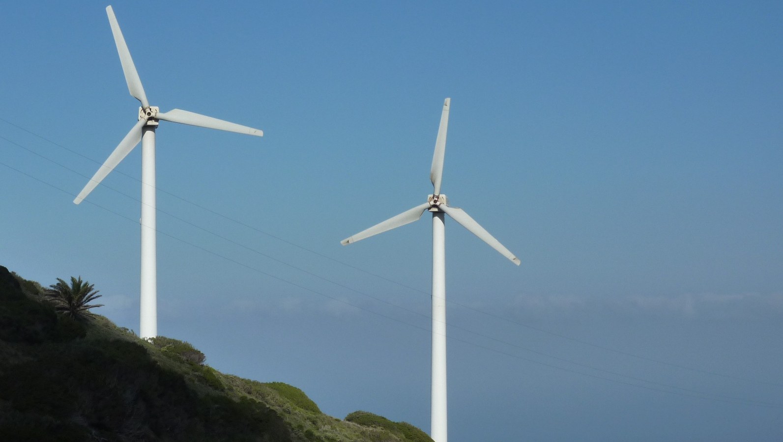 Bereits hinter den links von uns liegenden Windrädern macht die Straße eine Linkskehre. Nach 50 m treffen wir auf eine Öffnung in der Leitplanke. Hier wandern wir den beginnenden gelb-grün markierten Wanderweg rechts herunter, auf dem (02) Lomo del Espino (648 m). Bei immer wieder schönen Blicken in das vor uns liegende Tal von Alojera erreichen wir schlussendlich eine Schotterpiste, an der wir links gehen und sofort wieder dem rechten Abzweiger folgen.