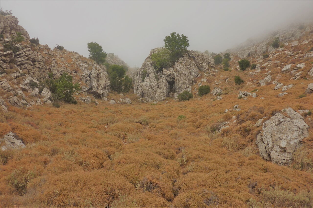 Nach 680 m – auf dem höchsten Punkt einer kleinen Höhe – biegen wir rechts ab und gehen auf dieser Piste 1,8 km bis zur 04 Schlüsselstelle eins (722 m), ein komplett wegloses Stück bis zu einer Ziegenhaltung. Wir erreichen eine kleine Ebene, auf der sich eine große Eiche befindet. Auf Höhe dieser Eiche verlassen wir die Linkskehre der Piste und gehen auf eine Art Mauer zu. Dahinter gelangen wir in eine kleine Senke und wandern über nicht bewirtschaftete Terrassenfelder auf eine weitere Eiche zu, um dann bei einer weiteren nachfolgenden Eiche rechts steil abzusteigen – in Richtung der Terrassenfelder im Tal. Ausgerichtet auf einen vereinzelt stehenden Baum gehen wir am Zaun entlang, um ein Terrassenfeld zu queren und einen Ziegenzaun zu öffnen und zu verschließen. Auf einem Ziegenpfad geht es durch ein kleines Waldstück, bis wir links oberhalb stehende Mauerreste mittig queren, eine Anhöhe übersteigen, auf vielen Ziegenfaden in südliche Richtung bergab gehen und in der Ferne eine Ziegenhaltung mit einem roten Dach erkennen.