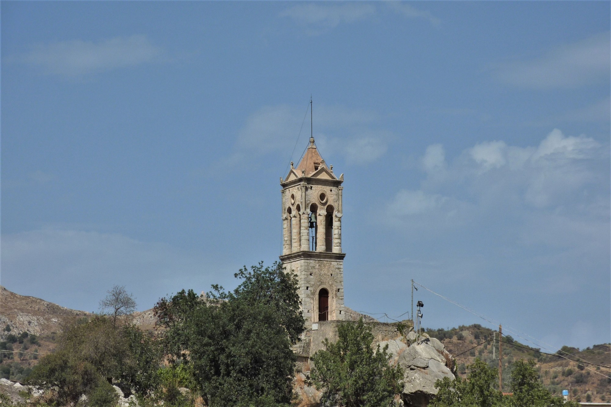 Wir gehen auf dem gleichen Weg zurück, halten uns bei der Weggabelung halb rechts und wechseln anschließend auf die bergauf führende Betonstraße, um dann nach 60 m rechts zu gehen. Angekommen im Dorf Opsigias geht es hinter der Kirche rechts hinunter auf die Asphaltstraße, bei der nächsten Möglichkeit links, nach 60 m links und sofort hinter der Kirche halb links – auf die ansteigende Piste. Im Dorf Amari endet unser Weg. Rechts sehen wir die wunderschöne, auf einen Felsen gebaute 03 Kirche von Agios Titos (461 m) – ein lohnenswerter Abstecher. Wir gehen 160 m links bergauf, die betonierte Straße geht in eine Asphaltstraße über, auch befindet sich hier ein einzeln stehender Wasserhahn. Wir biegen auf den alten Pfad links, dieser ist im weiteren Verlauf stark verwachsen und 6 aufeinanderfolgende Ziegengatter erschweren das Vorankommen. Auf der Asphaltstraße angekommen, wandern wir links an der Kapelle vorbei.