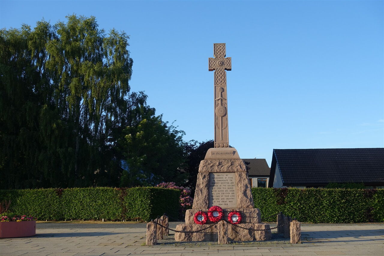 Von dem kleinen kostenlosen Parkplatz gegenüber dem Supermarkt in der Ortschaft 01 Fyvie (70 m) gehen wir auf der weiterführenden Straße an dem Denkmal für die Gefallenen aus dem Ersten Weltkrieg vorbei und biegen dann nach 75 m links in die Straße ab, die zum Fyvie Castle führt.