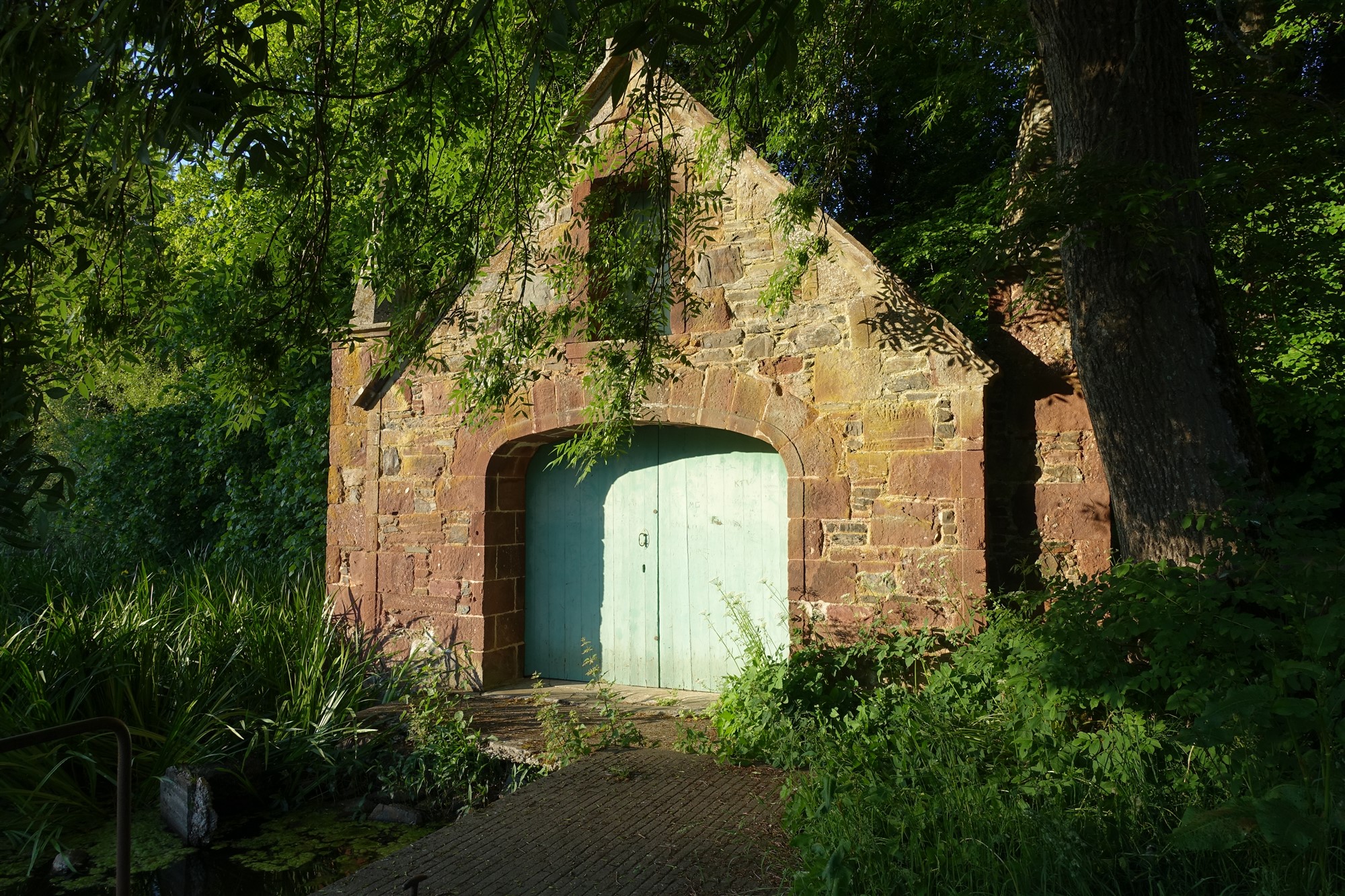 Vom Platz vor der Turmuhr am Schloss gehen wir nicht halb links bergab, sondern bis an die Weggabelung vom Hinweg vor. Hier gehen wir aber nun halb links an den Rhododendren vorbei. Hinter zwei Torbögen befindet sich auf der linken Seite der Eingang zum 04 Castle Garden (57 m). Solche mit einer hohen Mauer umfassten Gärten oder Höfe um mittelalterliche Abteien, Schlösser und Herrenhäuser wurden als Kräutergarten, Gemüsegarten und Obstgarten genutzt. Die hohe Mauer diente dazu, sie vor Wild und kräftigen Winden zu schützen. Wir queren den kostenpflichtigen Parkplatz und folgen dort dem gelben Wegweiser "Lochside Walk".