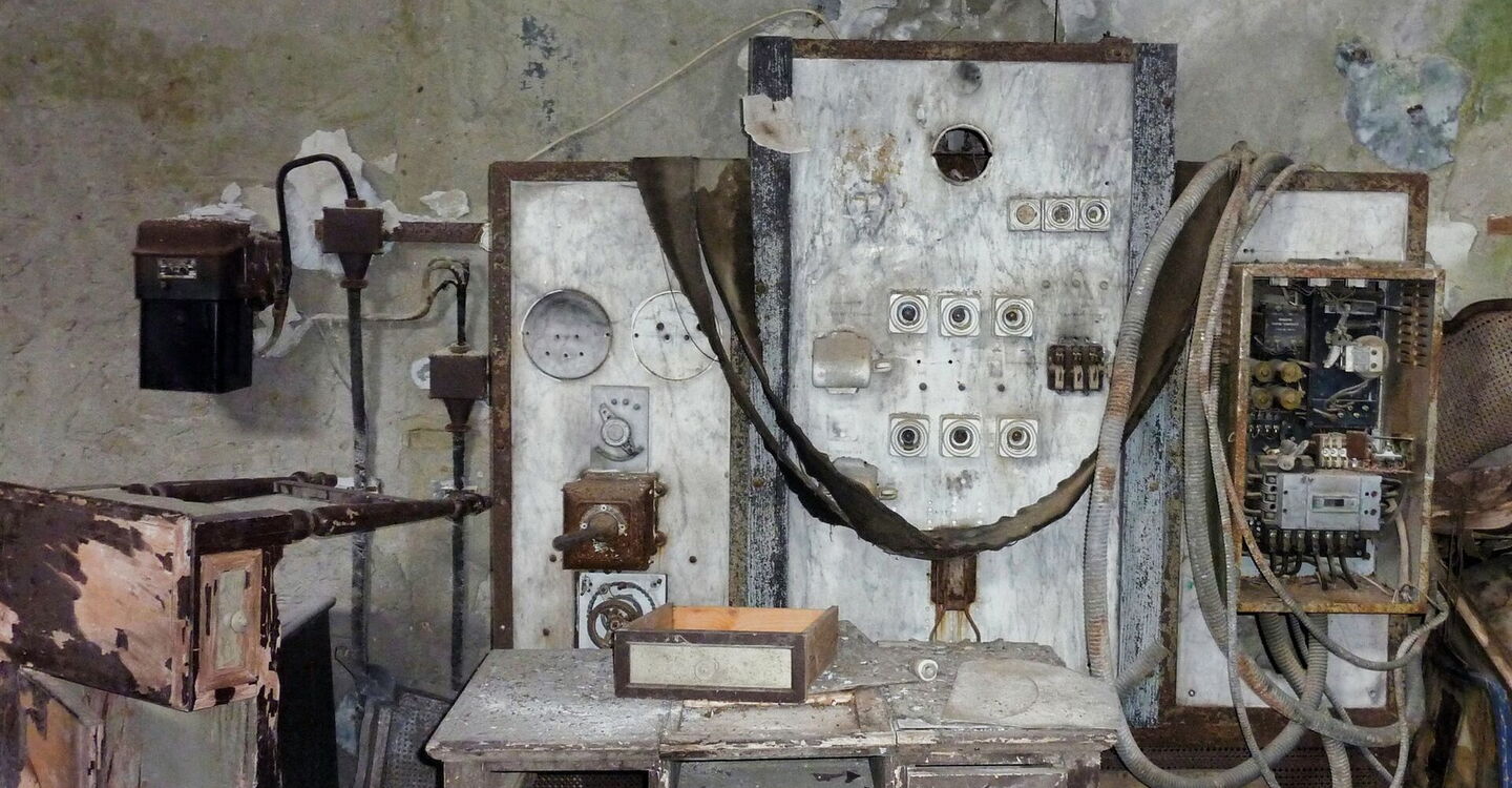 Vorbei führt der Weg an Steinhäusern, die in Tarnfarben bemalt sind – früher standen die Bäume noch nicht so eng an den Häusern. Diese dienten zur Unterbringung der Arbeiter und der Wache, zum Schutz des Gouverneurs und seiner erlesenen Gäste sowie als Werkstätten und Lagerräume. In der Ferne sehen wir ein weiteres Gebäude, die alte (02) Stromversorgung (594 m) der Anlage.